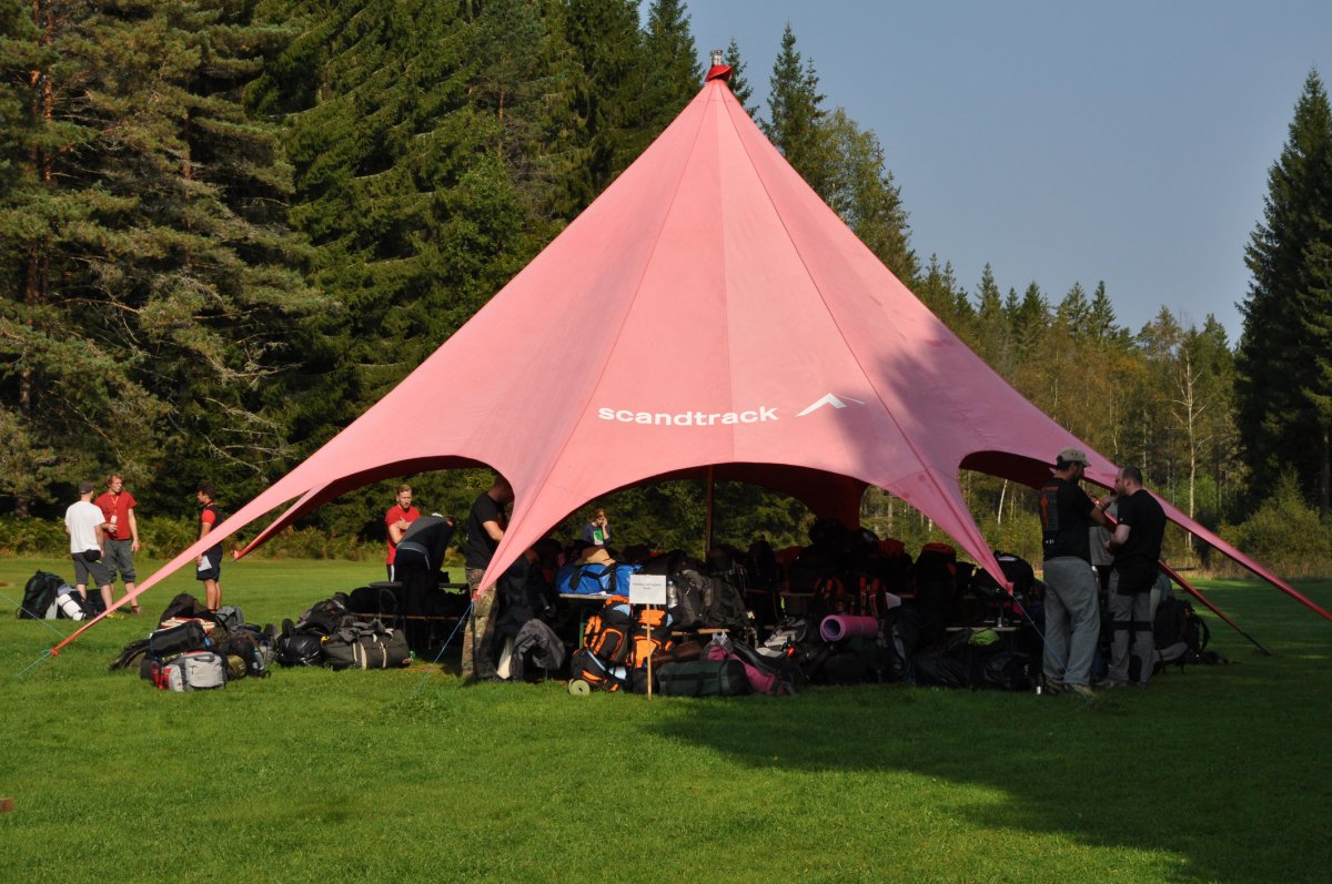 Für uns sollte die Tour in Hamburg starten. Wir reisten bereits einen Tag eher an, verlebten einen schönen Abend mit Freunden und erkundeten einen Tag lang die Stadt. Hamburg ist eine sehr interessante Stadt und mit dem super durchorganisierten Nahverkehrssystem gut zu erkunden. Wir waren also bereits mehrere Stunden auf den Beinen, als abends um 22:30 Uhr die Reise ins Abenteuer begann. Wir waren überrascht, wie viele Gleichgesinnte dieselbe Urlaubsidee wie wir hatten. Zumal wir im letzten Durchgang des Jahres unterwegs waren und der Herbst sicher nicht die bevorzugte Reisezeit für eine Paddeltour ist. Insgesamt kamen 4 Reisebusse in Lennartsforts an. Für uns endete die Anreise hier nach ziemlich genau 12 Stunden. K.o. aber voller Vorfreude waren wir gespannt auf das, was uns nun erwartete. Nach einem kleinen Imbiss zuckelten wir mit unserem Trolli über Wurzeln und schmale Pfade durch ein kleines Waldstück zum Basiscamp. Schon auf diesem kurzen Weg fielen uns die vielen Pilze auf, von extremer Größe und größtenteils essbar. Keinen schien es zu interessieren. In Deutschland hätte diese Fülle Völkerscharen in die Wälder gelockt.