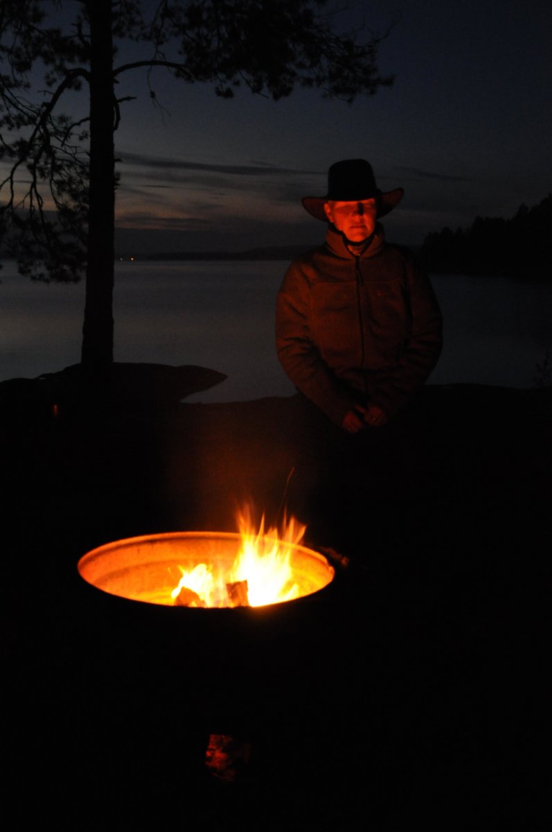 Besonders beliebt zum Übernachten waren natürlich die offiziellen Lagerplätze mit ihren Windsheltern. Da wir uns vorgenommen hatten, morgens auszuschlafen und dafür abends erst ab etwa 18:00 Uhr einen Übernachtungsplatz zu suchen, waren meist alle Shelter bereits mit fröhlichem Stimmengewirr erfüllt, wenn wir abends daran vorbeikamen. Am vorletzten Abend hatten wir überraschender Weise die Auswahl zwischen drei verschiedenen Sheltern. Wir entschieden uns für den, der auf der Insel gegenüber der unseres allerersten Lagerplatzes war und machten ein schönes Feuer. In den ersten Tagen hatten wir noch Probleme damit, da die Säge, die in der Campausrüstung enthalten war, immer klemmte und das Zurechtsägen des Brennholzes sehr mühselig war. Doch einige wenige Zähne an der Säge mit Hilfe der Zange des mitgeführten Multitools mit Gefühl geschränkt sorgte dafür, dass die Säge wie durch Butter durch das bereitliegende Brennholz schnitt. In dieser Nacht bauten wir kein Zelt auf und schliefen direkt im Shelter.