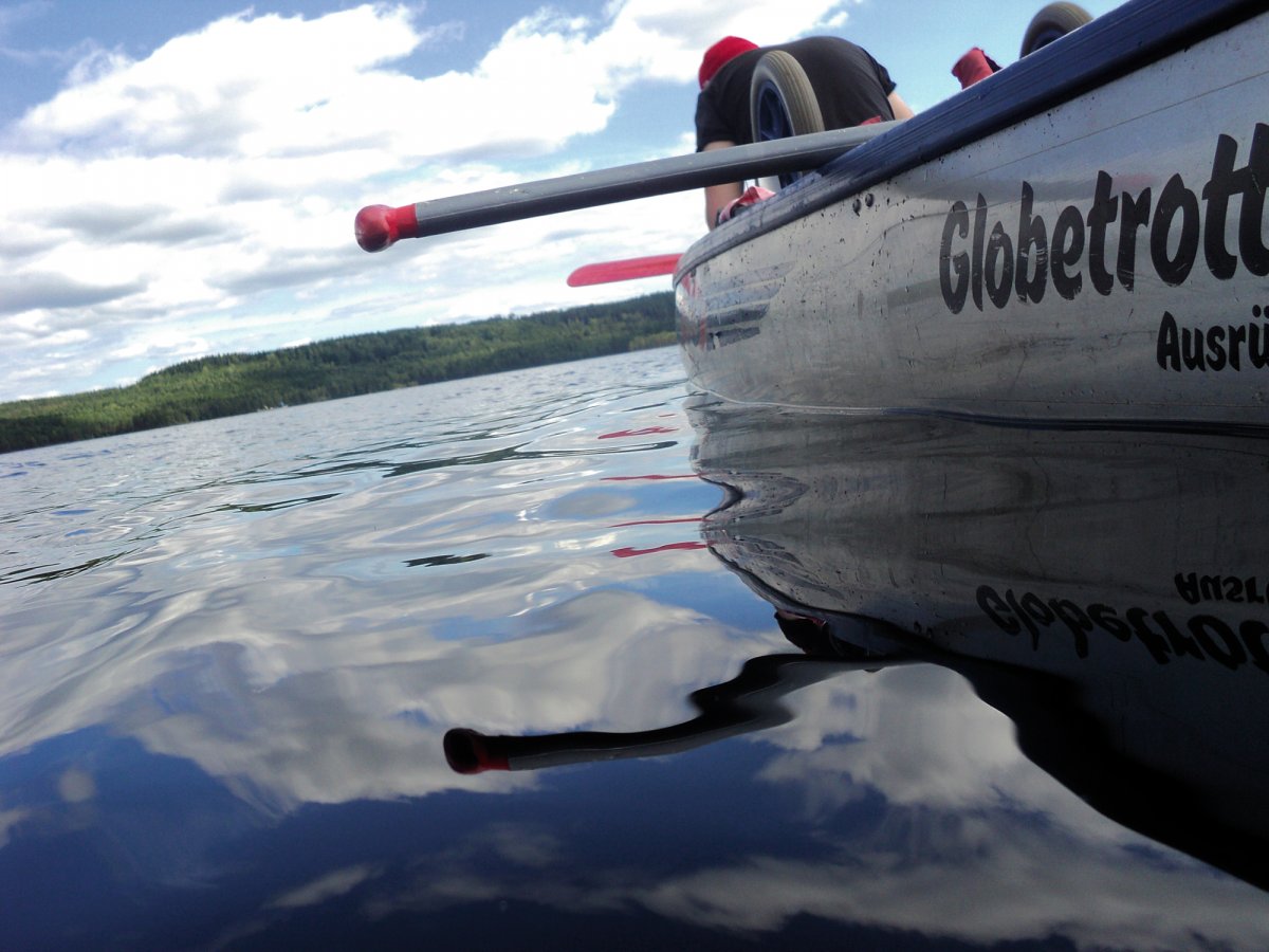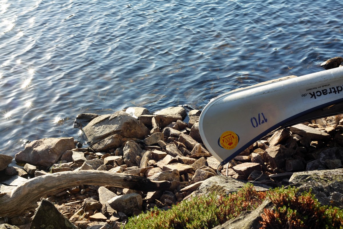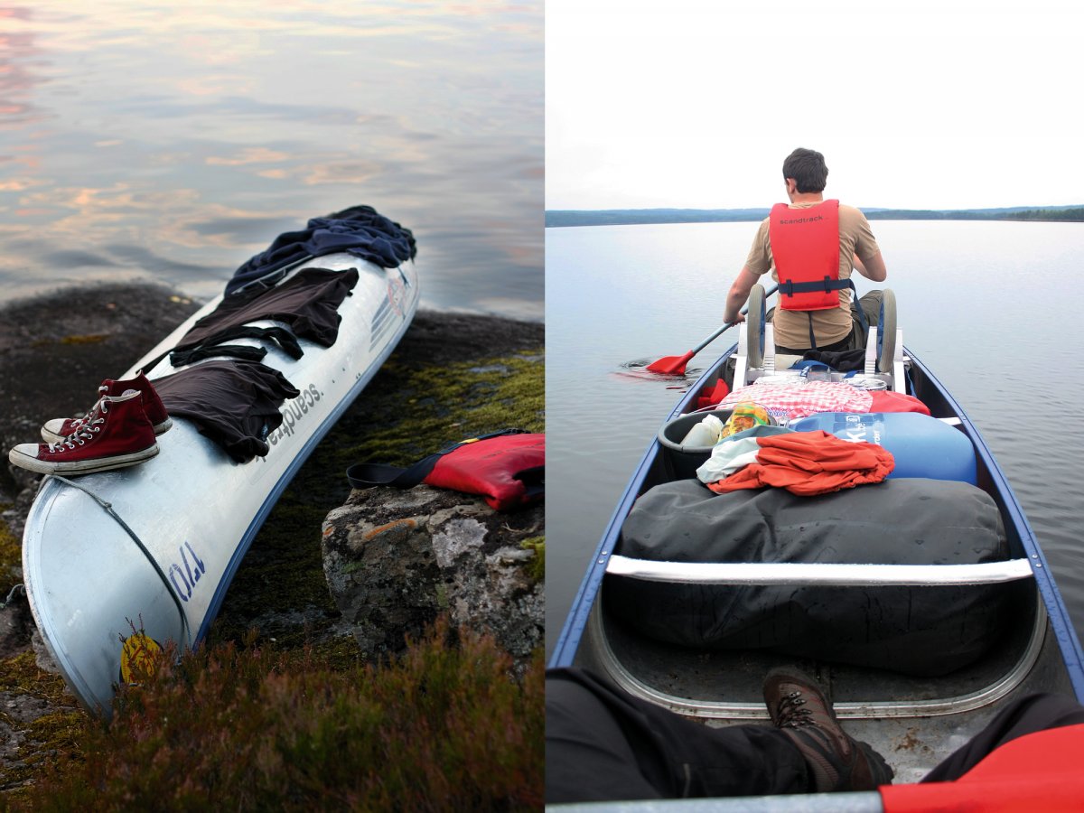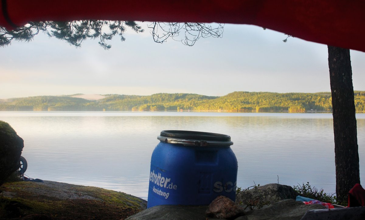 Nach 12 Jahren Freundschaft war es nun endlich mal Zeit für eine anständige Reise. Wir, dass sind Nils (23) und Fabian (22) und typische Stadtkinder, aufgewachsen im Ruhrgebiet. Mit Geologie und Geographie studieren wir zwar nicht unbedingt naturfremde Fächer, hatten jedoch mit Kanutouren ungefähr genau so viel Erfahrung wie mit dem Bau eines Space Shuttles. Was liegt da näher als sich einfach mal, auf eigene Faust, in die Wildnis Schwedens zu begeben und zu schauen ob man denn auch als Stadtkind ohne ein Handy oder angenehme Bahnverbindungen klar kommt. Und da es uns möglich war diesen Text hier zu verfassen, nimmt sich das Ende schon von selbst vorweg. Ja, wir haben überlebt. Aber zunächst stand natürlich erst einmal die Anreise auf dem Plan, mit grob geschätzten 18 Stunden Fahrt von Dortmund aus hatten wir direkt etwas worauf wir uns freuen konnten. Okay, nicht wirklich, jedoch wurde die Hinfahrt durch nette und humorvolle Busfahrer, welche schon beim Einpacken des Gepäcks zu Scherzen aufgelegt waren und durch die Möglichkeit an Bord kleinere, gekühlte, alkoholische Getränke käuflich zu erwerben, doch erheblich versüßt. Und auch eine nächtliche Fahrt mit einer Fähre hat im Halbschlaf einen beruhigenden und zu gleich erfrischenden Charakter und lässt sich nur empfehlen. Kurze Zeit später kamen wir auch schon im Basiscamp an und wurden wieder einmal freundlichst empfangen und mit einem kleinen Snack und Getränken begrüßt. Nach weiterer Organisation hatten wir schließlich unsere Ausrüstung, unser Kanu und den Willen nun auch mal Wasser von nahem zu sehen. Wenig später fanden wir uns auch schon mitten auf dem ersten See wieder, rückblickend eindeutig nicht unsere beste Idee direkt relativ weit vom Ufer entfernt unsere Paddelfähigkeiten auf die Probe zu stellen. Kaum eine halbe Stunde unterwegs steuerten wir direkt in ein ausgewachsenen Gewitter hinein und als die ersten Blitze an Land aufleuchteten und wir innerhalb weniger Augenblicke bis auf die Knochen nass waren, denn kurz vorher war schließlich bestes Wetter und die Regenjacken waren im Rucksack geblieben, wurde uns bewusst, dass wir nun doch schleunigst zum Ufer gelangen sollten. In der Ferne konnten wir ein rotes Scandtrack Zelt entdecken und steuerten geradewegs drauf zu, schließlich wollten wir nur wieder Land unter den Füßen haben. Gestrandet bei einer netten Familie konnten wir unsere Sachen wechseln und natürlich ließ das Gewitter innerhalb weniger Minuten nach und wir konnten zu unserer ersten Insel reisen, auf welcher wir unser Lager aufschlugen.