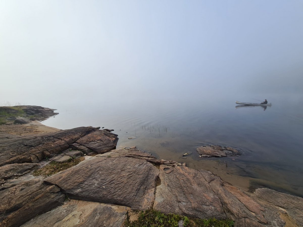 Wie bereits erwähnt fuhr also um 13:30 Uhr das Chaos Duo gen Norden und hatte nur ein Ziel; es wird solang gepaddelt bis kein Kanu mehr am Horizont zu sehen ist. Gesagt, getan. Nach 20 Kilometern wurde es schließlich Zeit für eine Pause, verbunden mit einer Pilzsammelaktion auf einer nahegelegenen Landzunge.