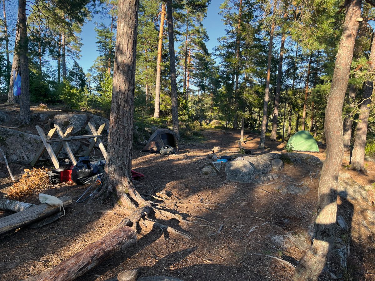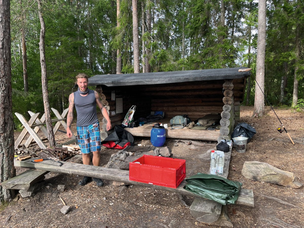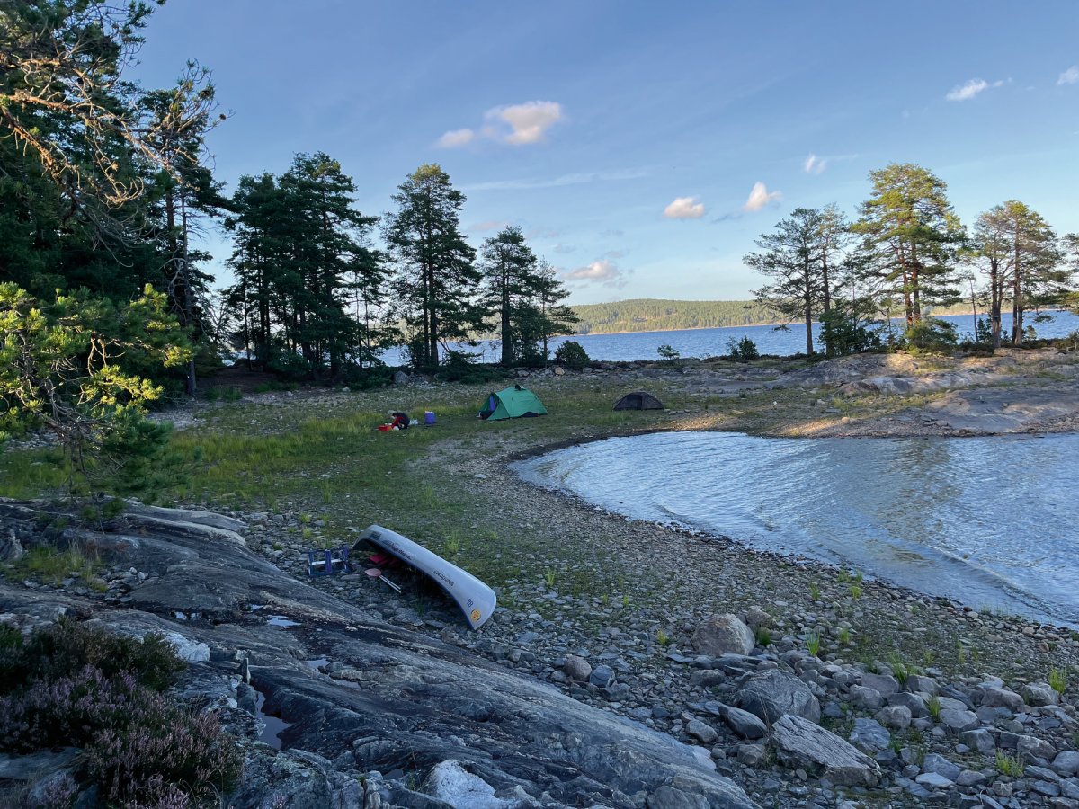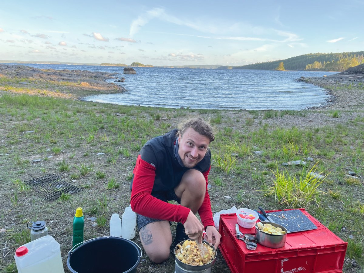 Die Ausbeute war beachtlich und die Vorfreude auf ein leckeres Abendessen daher umso größer. Nach der Sammelaktion begaben wir uns also wieder ins Kanu und fuhren das erste Dano der Insel Bärön an. Kurz vor dem erreichen des Ziels fiel dem Kapitän der Nussschale auf, dass wichtiges Gut (manche nennen es auch Gemüse), auf der Landzunge zurückgelassen wurde. Es dauerte keine Sekunde dass feststand, es wird umgekehrt! Denn nichts und niemand wird auf dem wilden Abenteuer zurückgelassen. Leider stellte sich zu diesem Zeitpunkt heraus, dass Neptun nicht sonderlich positiv auf das Chaos Duo gestimmt war. Auf dem Rückweg zur Landzunge, trieb die Nussschale also von links nach rechts und schwankte in alle Richtungen. Nach unzähligen Kilometern beratschlagten wir uns also, da uns der Rückweg deutlich länger vorkam, als der Hinweg. Und so kam die Erleuchtung. Neptun trieb das Duo 6 Kilometer zu weit gen Norden. Ab diesem Zeitpunkt hieß es Zähne zusammenbeißen und zurück zur Landzunge zu paddeln. Nach 30 Kilometern paddeln erreichten wir die Landzunge, fanden das verlorene Gemüse und blieben schließlich für die erste Nacht auf der Landzunge. Somit war die Pfanne aus Bratkartoffeln, Zwiebeln und selbst gesammelten Pilzen auch wohl verdient. So neigte sich unser erstes Erlebnis dem Ende.