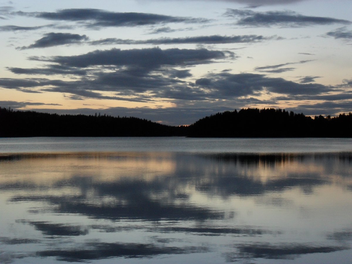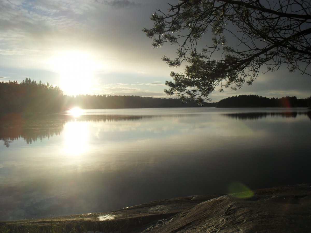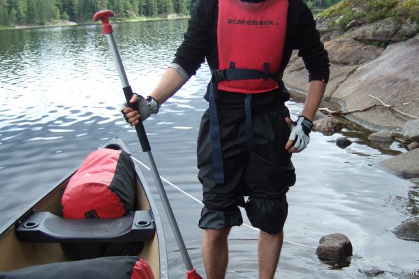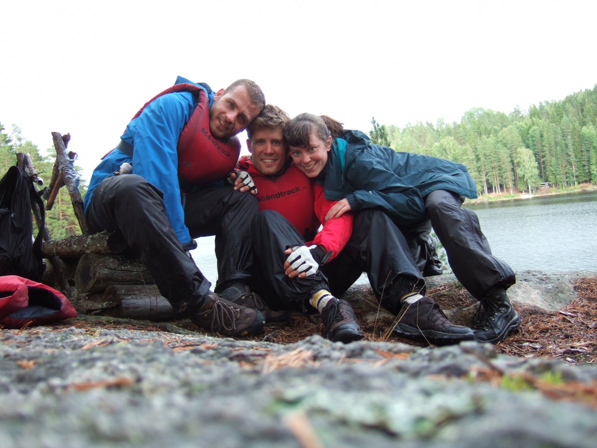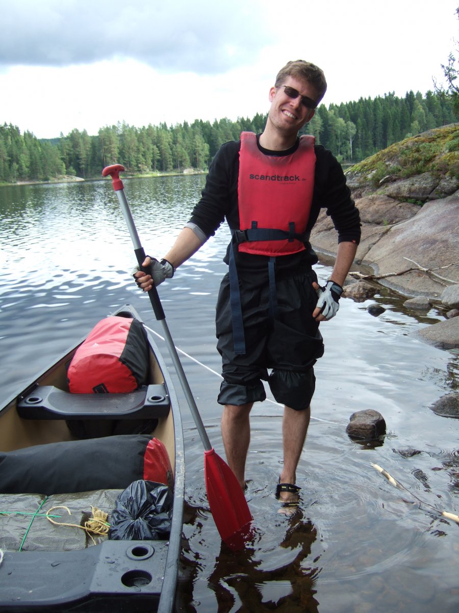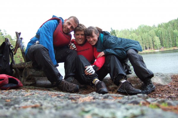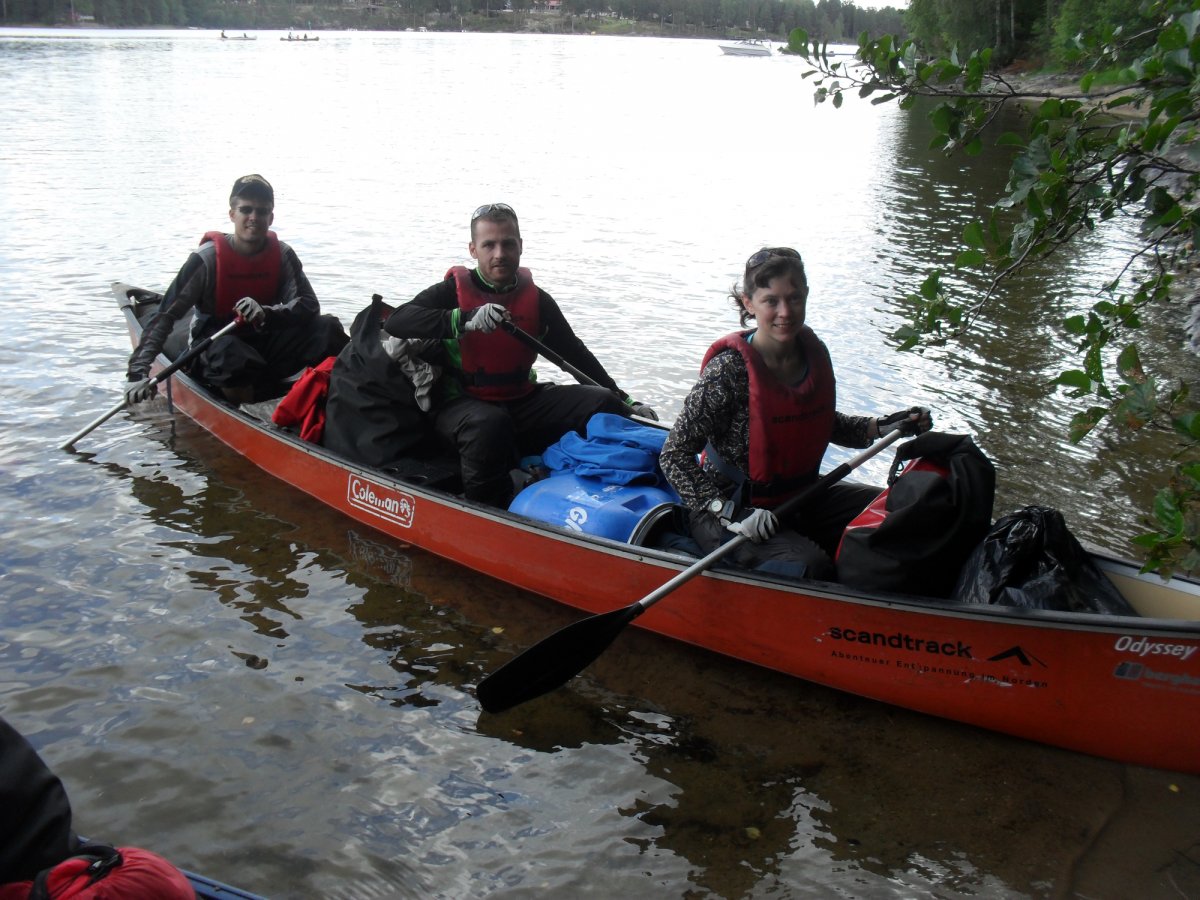 Nach der Ankunft mit dem Scandtrack-Reisebus erhalten wir im Basislager in Lennartsfors zunächst eine warme Mahlzeit und dann das Material für eine Woche. Das alles jedoch bei strömendem Regen. „Das kann ja heiter werden – wenn das jetzt eine Woche so weiter geht…“, denken wir, doch pünktlich zur Abfahrt im Kanu reißt der Himmel auf, die Sonne scheint und wir paddeln in das unendliche Blau hinein.