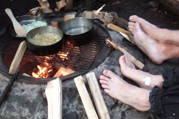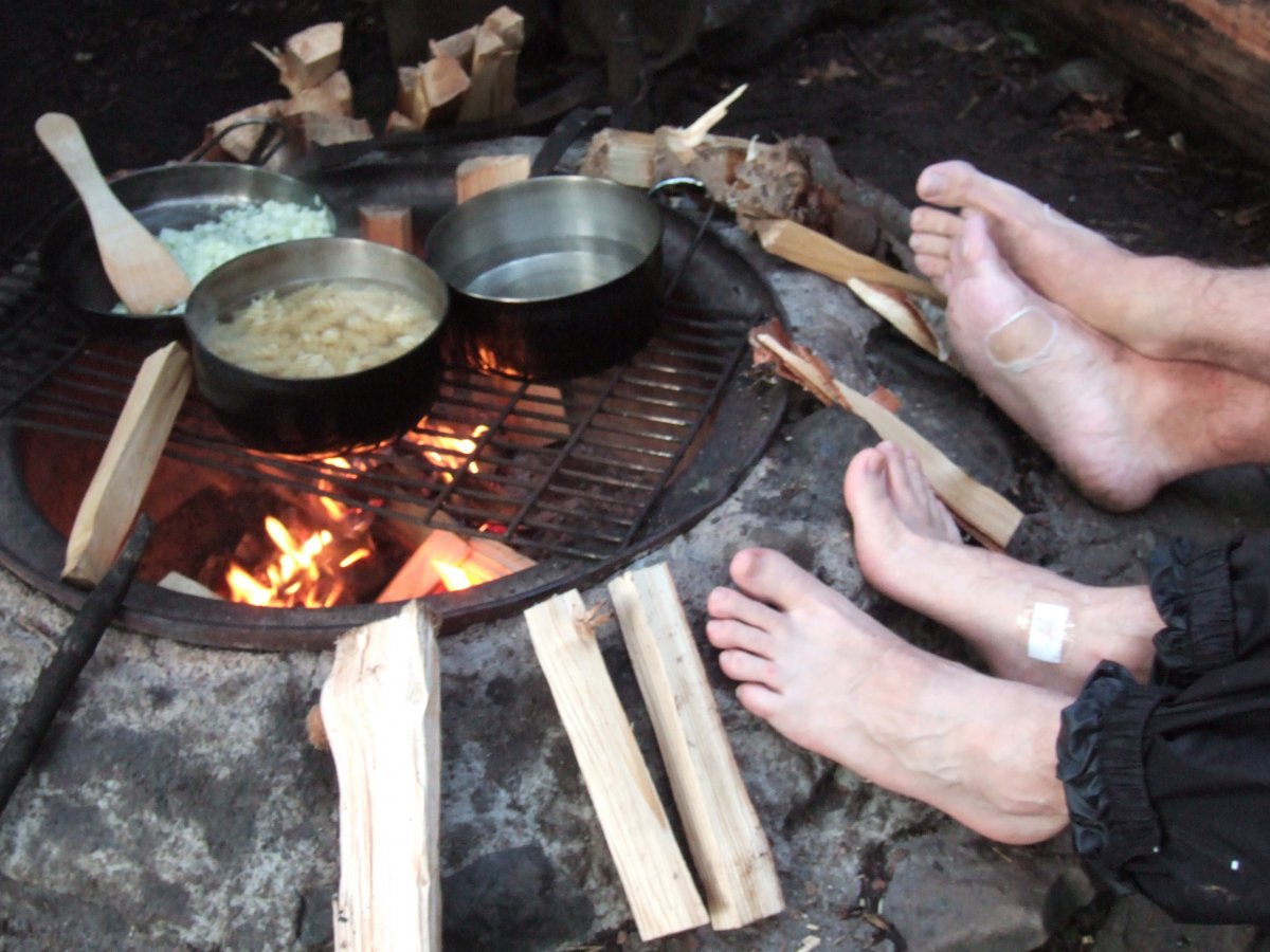 Das Lagerfeuer teilen wir heute mit zwei erfahrenen Pfadfindern: Sie geben uns trockenes Feuerholz, wir ihnen dafür etwas von unserem leckeren Pilzgericht.