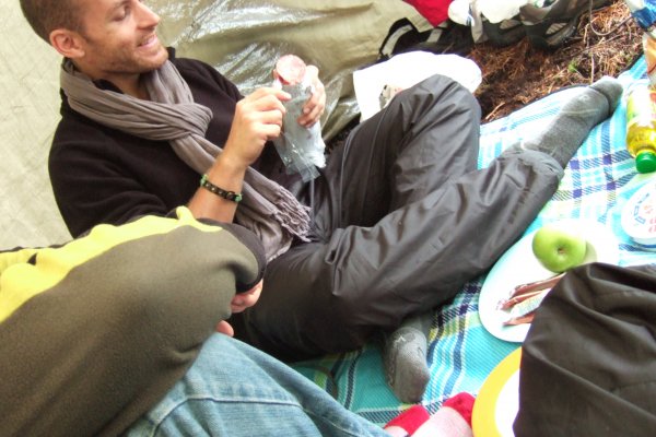 Wir wachen mit der angenehmen Überraschung auf, dass kaum ein Tropfen Regen in der Nacht gefallen ist… Sogar die Sonne scheint! Wir nutzen die Gelegenheit zu einem Bad noch vor dem Frühstück und zu einem ausgedehnten Spaziergang. Heute ist außerdem Laurents Geburtstag! Er bekommt Schokomuffins mit einem Streichholz als Kerze - wegen der allgegenwärtigen Feuchtigkeit brennt es nur kurz, aber es ist ja bekanntlich die Geste, die zählt