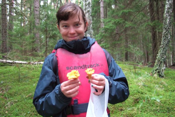 (fünfte Lektion), entdecken dafür aber unzählige Steinpilze und Pfifferlinge und schließlich auch wieder unser Kanu – uff! Wir hatten schon damit gerechnet, die Insel schwimmend umrunden zu müssen, um es wieder zu finden…