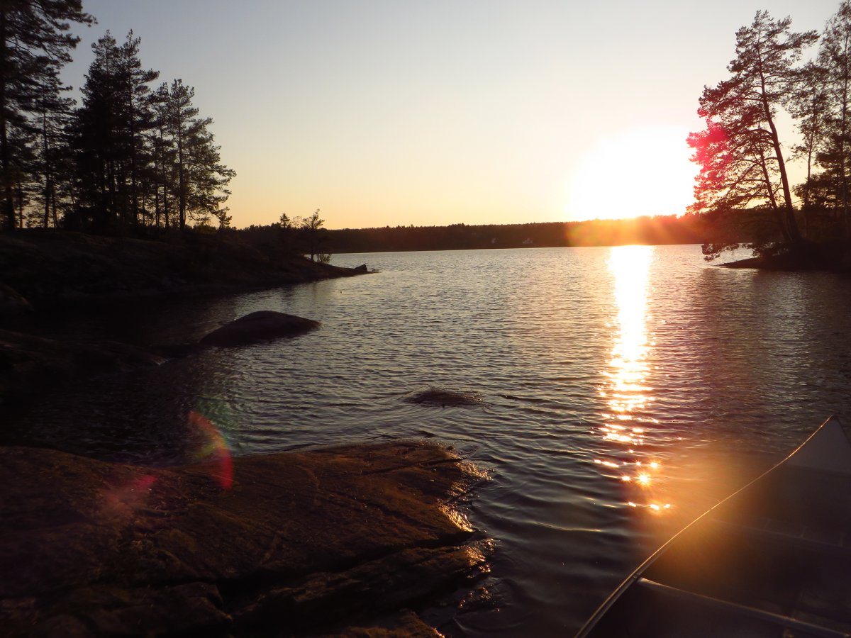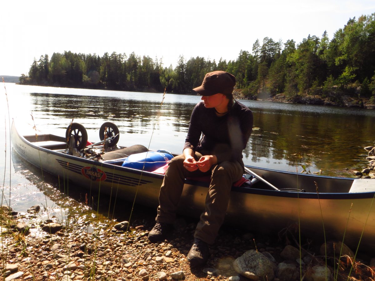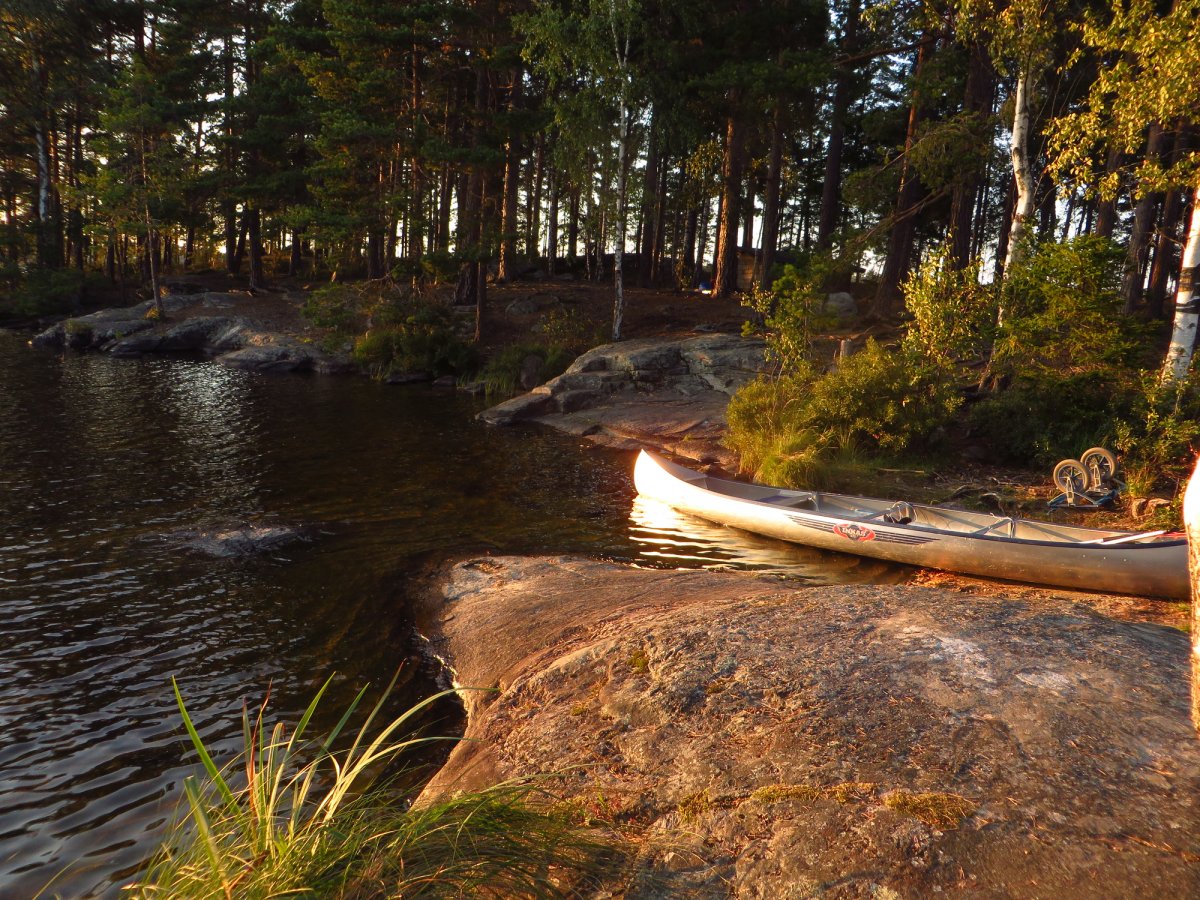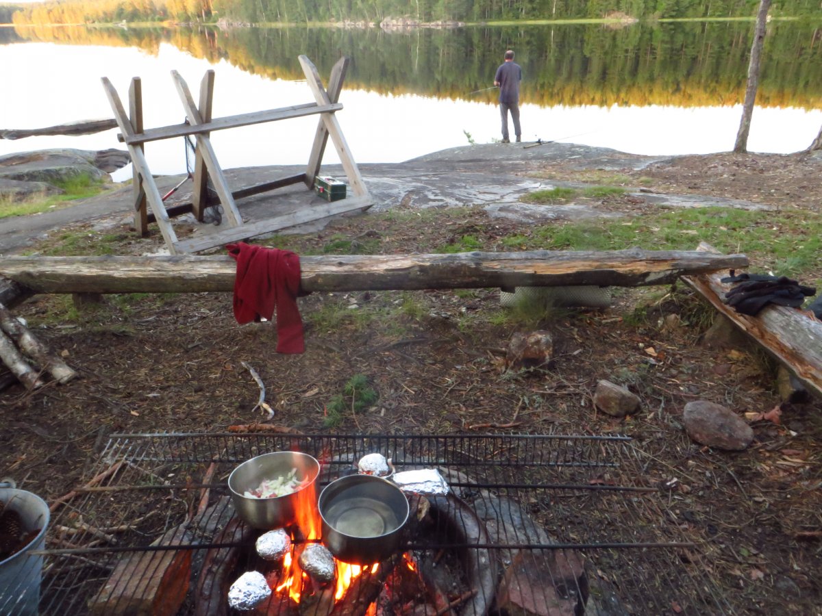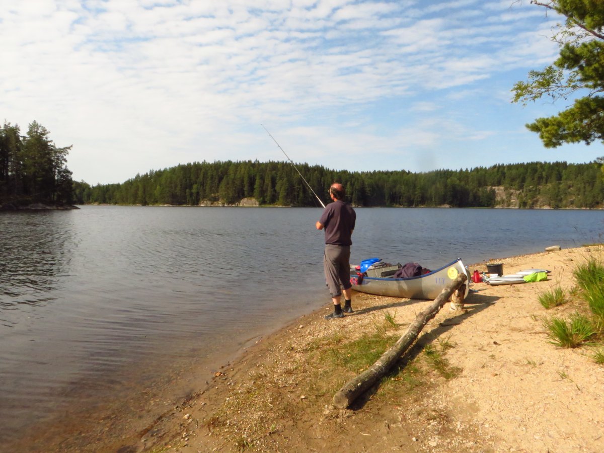 Schnell haben wir uns an den neuen Alltag gewöhnt. Mein Vater ist bei Sonnenaufgang aufgestanden und ist Angeln gegangen, während ich noch etwas die mollige Wärme meines Schlafsacks genossen habe. Sobald der erste Fisch des Tages gefangen war, wurde das Camp abgebaut, alles im Kanu verpackt und losgepaddelt, um einen schönen sonnigen Platz im Windschatten zu suchen fürs Frühstück. Nach einem reichlichen Frühstück aus der Provianttonne wurde weiter gepaddelt. Wir hatten es nicht eilig und konnten ganz in Ruhe die wunderschöne Landschaft und die Sonne genießen und zwischendrin immer mal wieder die Angel auswerfen. Eine geplante Strecke hatten wir dabei übrigens selten. Am Tag vor der Abreise aus Deutschland haben wir einen Blick auf die Karte geworfen und beschlossen nach Norden loszupaddeln. Danach haben wir jeden Abend auf die Karte geschaut und uns überlegt, wo wir am nächsten Tag lang paddeln könnten. Dieser „Plan“ wurde allerdings nicht selten bereits in der Frühstückspause und spätestens am Nachmittag über den Haufen geworfen. Schlussendlich haben wir uns jeden Abend einfach ein schönes Plätzchen gesucht und dort unser Lager aufgeschlagen. Wenn wir Glück hatten und einen freien DANO Lagerplatz gefunden haben, konnten wir ein Feuer machen und über der offenen Flamme kochen. Ansonsten kam der Spiritusbrenner zum Einsatz. Die Provianttonne von Scandtrack war mehr als reichlich gefüllt, sodass es uns an Nichts fehlte. Nur der gelegentliche frisch gefangene Barsch hat die Speisekarte erweitert. „Gelegentlich“ im Sinne von: Ich habe während dieser Kanutour so viel Fisch gegessen, wie das ganze restliche Jahr nicht! Während das Feuer noch langsam herunterbrannte, wurde auch immer direkt ein Topf Kaffee gekocht, der in eine Thermosflasche abgefüllt wurde. So konnte man den nächsten Morgen entspannt mit einer Tasse Kaffee starten konnte, ohne auf heiß Wasser warten zu müssen. Denn das Leben in der Natur ist entschleunigt und so dauert auch eine Tasse Kaffee kochen dort wesentlich länger als in der heimischen Küche.