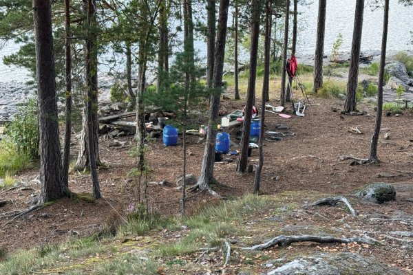 Ziel war zuerst Trollön, wenn da nichts frei gewesen wäre, wäre es weiter gegangen, aber eine junge Vierergruppe brach grade auf und so hatten wir ein Dano. Also alles wie immer: Kanus ausladen, alles hochtragen, Feuer anmachen, Schlafplätze einrichten. Durch das gemeldete Wetter spannten wir noch Planen, dass wir halbwegs trocken sitzen konnten, was uns auch gelang.