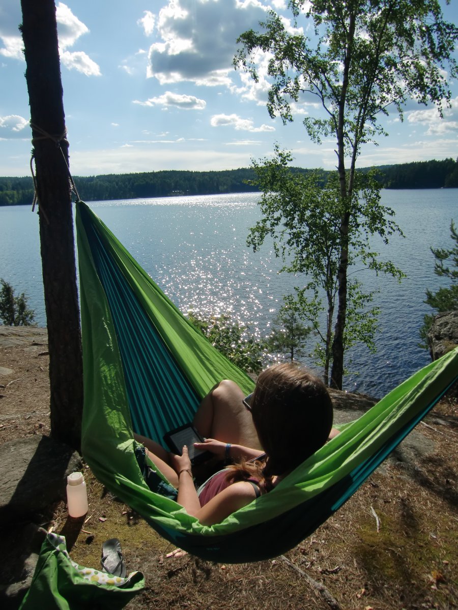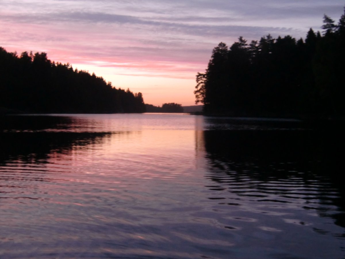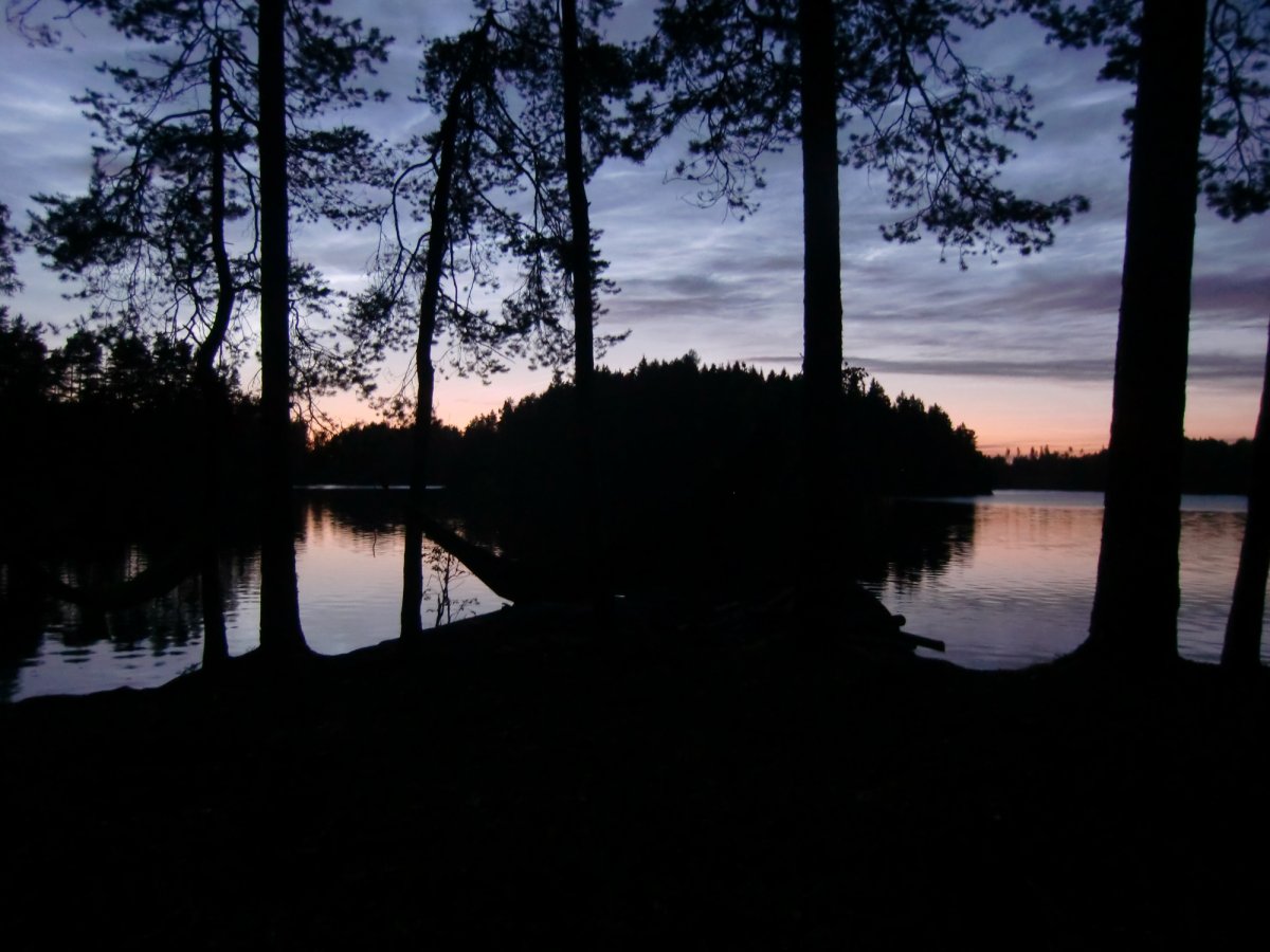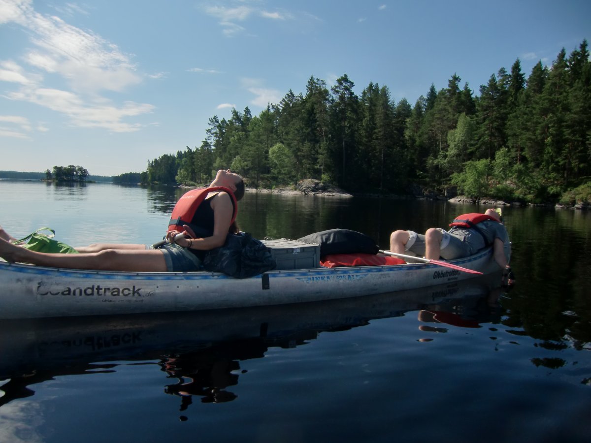 Schon am nächsten Tag zeigte sich, als wir gerade unsere alltägliche Tour antraten, die Sonne, die uns auch fast die gesamte Woche begleitete. So fanden wir schnell eine tägliche Relax-Routine: in Ruhe aufstehen, Frühstück vorbereiten, frühstücken, Sachen packen und einladen, Kanufahren, Sachen auspacken, Lager errichten, Schwimmen, Feuer machen, Angeln, Kochen (Pizza, Pfannkuchen, Stockbrut, Apfel-Waldbeer-Kompott, Reispfanne, Bohneneintopf, Nudeln mit Tomaten- und Käsesoße etc.) und einfach nur relaxen. Wer denkt, dass es langweilig werden könnte, irrt sich. Man kann einfach nur entspannen und das Leben in der Natur genießen. Die Proviantfässer und die Ausrüstung tragen natürlich dazu bei, dass es einem dabei an nichts fehlt. Noch besser ist das ganze, wenn man sich eine Hängematte gönnt, in der man abends am Seeufer den Sonnenuntergang genießen kann. Das Schwimmen im Foxen ist traumhaft, die Sonnenuntergänge unvergleichlich schön und das Leben (fast) ganz ohne Luxus die beste Möglichkeit, richtig zu entspannen.