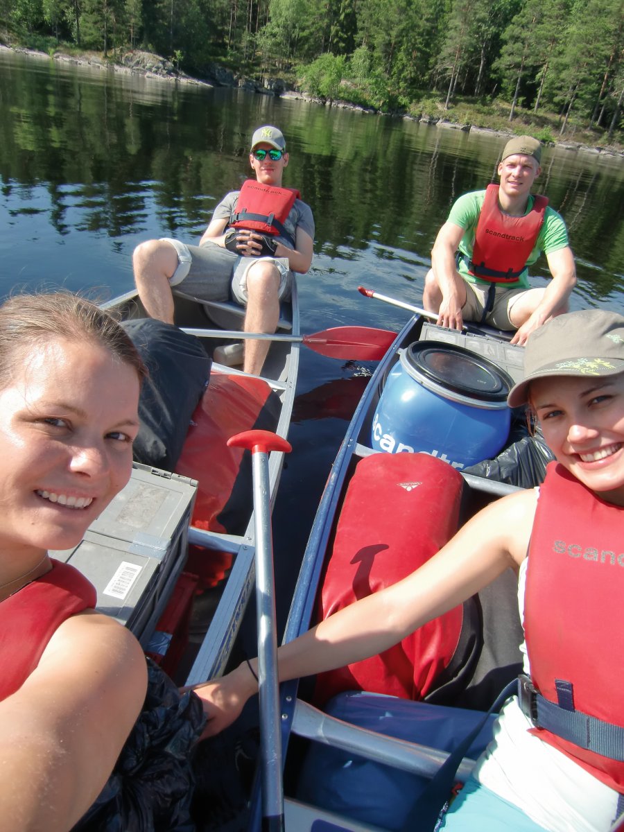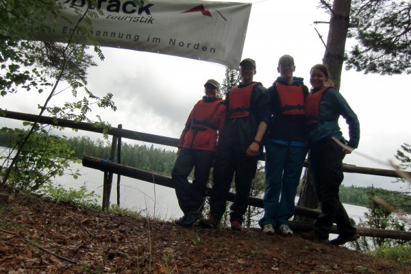 Endlich am Ziel angekommen, war das Wetter leider nicht so gut, wodurch wir sofort unsere Regenausrüstung auf die Probe stellen konnten, bevor wir uns auf die Hotdogs im Basiscamp stürzten und unser Gepäck weiter zur Materialausgabe trugen. Hier bekamen wir unsere weitere Ausrüstung relativ schnell. Nur mit dem Verpacken der ganzen Sachen, die wir mitgebracht hatten, hatten wir so unsere Schwierigkeiten. Zwei zusätzlich erfragte Packkisten brachten uns weiter und so konnten wir auch bald lospaddeln. Obwohl wir bisher kaum Kanuerfahrung hatten, fanden wir schnell unseren Rhythmus und legten – anders als zunächst geplant – sogar 10 km bis nach Norwegen zurück und hatten somit schon eins unserer Ziele für den Urlaub erreicht. Nachdem wir die Kanus aus dem Wasser gehoben und alle Sachen zum auserwählten Zeltplatz getragen hatten, freuten wir uns auf unsere erste Mahlzeit am Lagerfeuer – Bratkartoffeln. Ein super Start in einen Urlaub zum Abschalten und Genießen in Schweden.