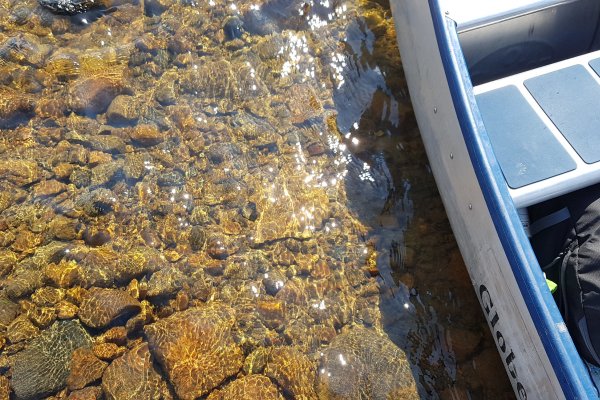 7.Tag: Huch, da sind ja noch andere Urlauber. Nach dem Aufwachen wurde das erste Mal ein „Abreise-Feeling“ bemerkbar. Einige - stets freundliche – Scandtracker passierten unser „Wohnzimmer“ . Auch wir machten uns langsam auf, bei wunderbarem Sonnenschein und ruhigem Gewässer, sollten wir am letzten Abend ein drittes Mal eine eigene Insel finden. Schon ziemlich nah am Höglund-Camp und in Sichtweite viele rote Scandtrack-Zelte, hatten wir noch immer ein Gefühl schwedischer Einsamkeit. Die inzwischen recht leichte Essenstonne wird nun geplündert, es wird gespeist, wonach einem beliebt, die Tafel ist angerichtet. Die Nähe zur Zivilisation lässt in der Nacht dennoch vielfältige Tiergeräusche zu, eine Mischung aus Aufregung und Grusel beschert eine völlige neue Gefühlswelt. Ein letztes Mal Ruhe, Einsamkeit, wunderschöne Natur, glasklares Wasser, intime Gespräche, einzigartige Essensideen und die Erkenntnis, wie wenig man braucht, um glücklich zu sein. Reim des Tages: Wonach steht dir der Sinn, in der Scandtrack-Essenstonne ist wirklich viel drin.