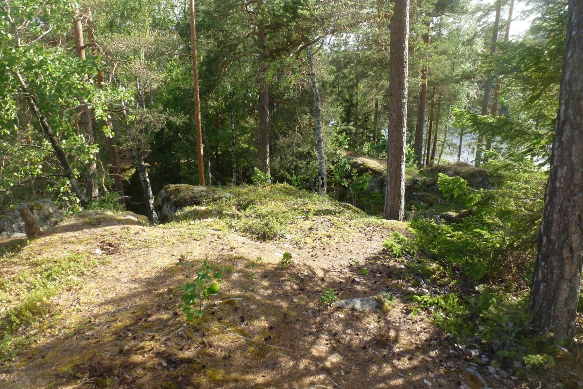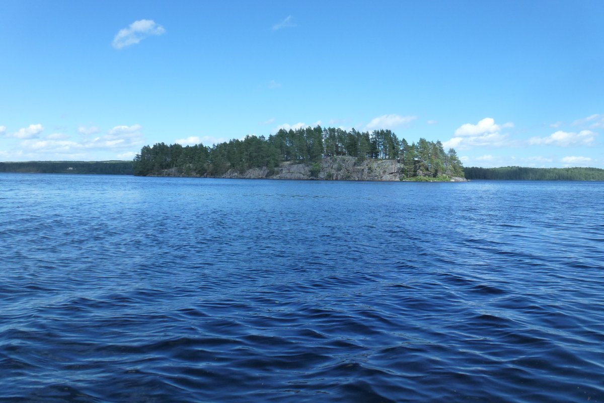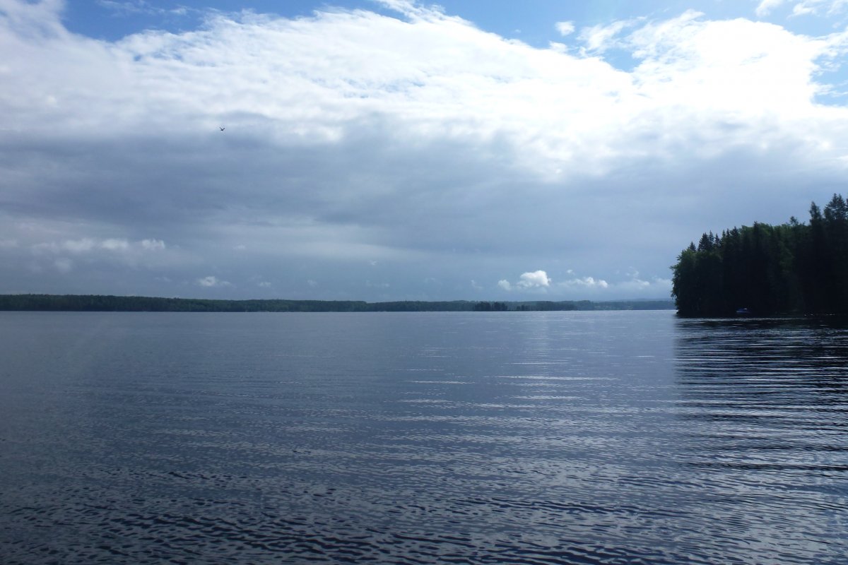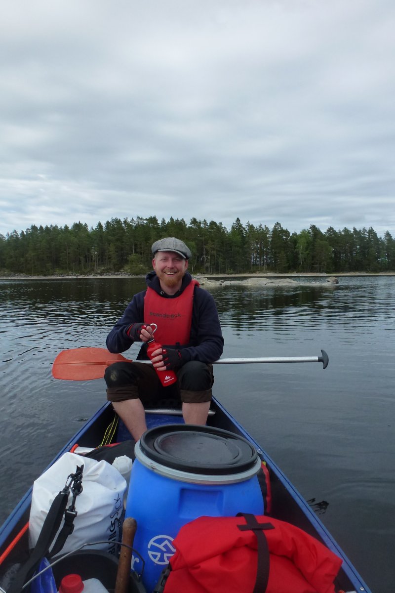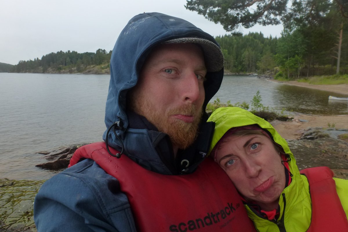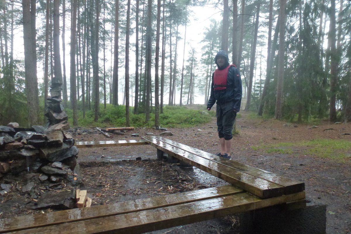 Ziel war DANO 8 (norwegische Seite der Insel) und nur knappe 5 km entfernt; ein Katzensprung im Vergleich zu unseren bisherigen Tagestouren. Kaum hatten wir das Kanu beladen, begann ein Gewitter und wir waren gezwungen an Land auszuharren. Zum Glück zeigte uns der Regenradar, dass das Gewitter nur klein war und bald durchgezogen sein sollte. Unmittelbar danach brachen wir auf um möglichst viel vom Tag im neuen DANO verbringen zu können. Es hatte sich eingeregnet und trotz vernünftiger Kleidung waren wir an allen frei liegenden Körperstellen (Erkenntnis: eine Regenhose wäre ne gute Idee gewesen) innerhalb einiger Momente klatschnass. Die Temperatur war im Vergleich zum Vortag kaum gestiegen, der Regen stärker und etwa acht bis neun Kilometer südlich tobte ein ordentliches Gewitter, zum Glück weit entfernt... In dieser Stimmung setzten wir zur Insel über und übersahen die Landestelle des DANOs zuerst, weil dort kein Kanu lag und auch anders als an den anderen Lagern keine Schutzhütte vom Wasser aus zu sehen war. Unglücklicherweise hatte ich gerade an diesem Tag den Fehler gemacht die Karte in meiner anderen Hose vergessen zu haben, so dass wir an Land gehen, die Karte hervorholen, das Kanu neu beladen und erneut in See stechen mussten; 500 Meter zurück hieß die Parole. Kaum waren wir wieder auf dem Wasser fing es von jetzt auf gleich zu hageln an, das Wasser wurde schaumig weiß und erbsengroße Hagelkörner trommelten auf uns ein, begleitet vom Donnern des Gewitters in unserem Rücken auf unserem Weg zurück nach Norden. Unsere Zielbucht vor Augen zerriss auf einen Schlag ein Blitz den Himmel vor uns und zeigte uns mit seinem Donner, dass er weniger als einen Kilometer von uns entfernt eingeschlagen ist – das Gewitter hatte sich in unglaublich kurzer Zeit zu uns verlagert. Jetzt hieß es "Paddel frei!" und alle Kraft unserer panischen Arme ließ uns mit hohem Tempo auf die Bucht zujagen, die Kanus an Land ziehen und in das Wäldchen stürmen. Glücklicherweise ist auch einem weiteren Kanu, welches gerade mitten in der Überfahrt zur Insel begriffen war, nichts passiert!