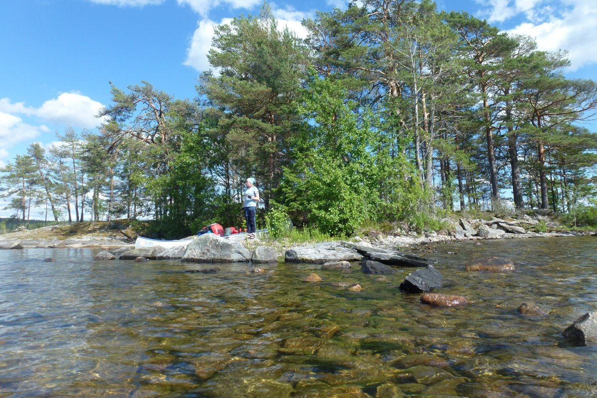 Zelt aufgebaut und geprüft, restliche Ausrüstung in Augenschein genommen und zum Wasser getragen, Spiritus gekauft, da Lagerfeuer immer noch verboten waren und alles ab ins Boot und in die Nebenbucht gepaddelt um dort ganz in Ruhe alles umladen und packen zu können. Eine kleine Ewigkeit später war alles drin was mit sollte, der Wagen auf dem Parkplatz und wir zwei im Kanu... und nach ein paar Paddelschlägen kam eine ganz kuriose Einsicht: Wir sind jetzt mal weg!