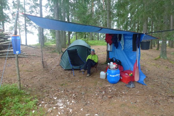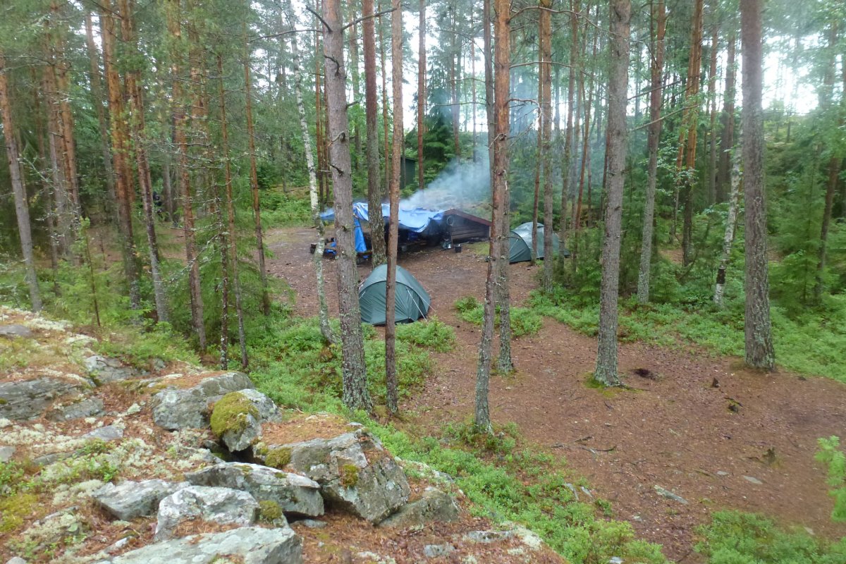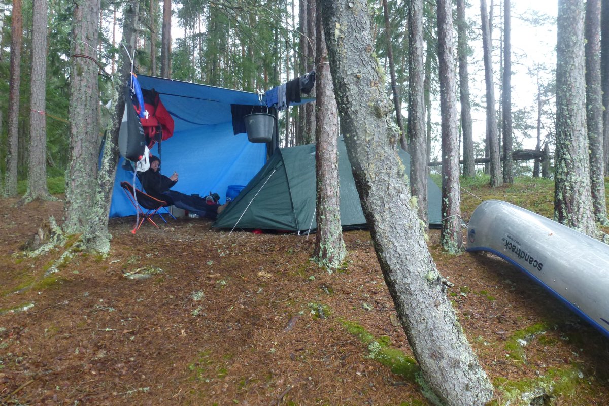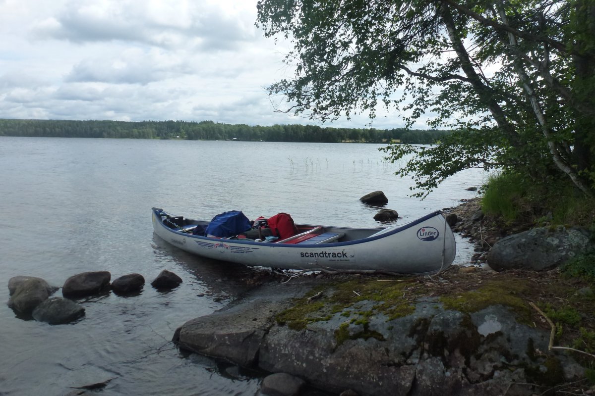 Was in den Wochen vor unserer Abfahrt noch unser sehnlichster Wunsch war, kam nun zur Unzeit. Einige Zeit vor unserem Urlaub wurden wir von Scandtrack informiert, dass durch die sehr lange sehr heiße und staubtrockene Zeit die Wälder zu Zunder geworden sind und daher Feuer streng verboten war. Regelmäßige Blicke auf die Wetterkarte zeigten uns ab etwa einer Woche vor unserem Urlaub Regen an... wir hofften auf ausreichend davon BEVOR wir nach Schweden kamen, dass wir bei unserem Wildnisurlaub auch das obligatorische Lagerfeuer entzünden könnten. Frohen Mutes und im gerade pünktlich abebbenden Regen erreichten wir das Camp und wurden nett empfangen, jedoch mit einem freundlichen Rat zur Eile angehalten: der Bus saß uns im Nacken und die große Meute sollte etwa eine Viertelstunde nach uns eintreffen. Jetzt hieß es Beine in die Hand nehmen und sehen, dass wir das Equipment zügig aufs Wasser bekommen.