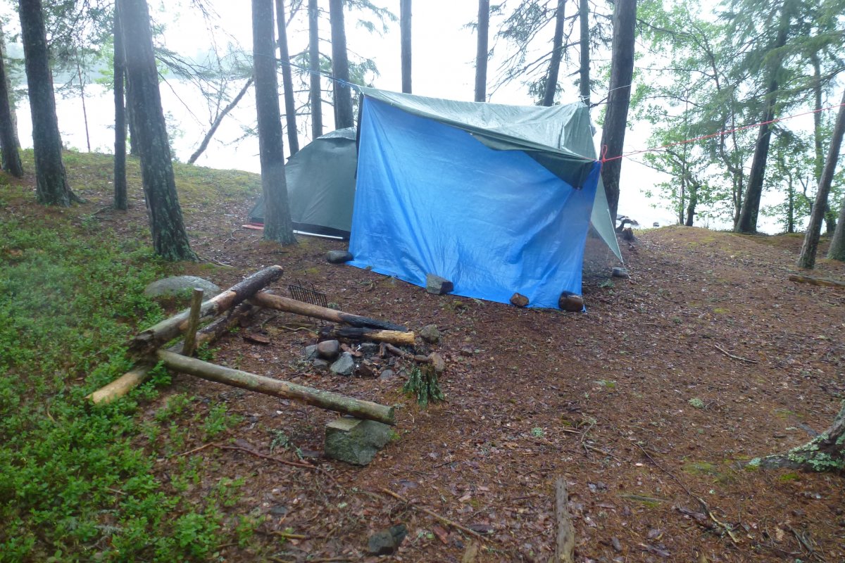 - Erkenntnis fünf: Eine zusätzliche Plane und Seile/ Gurte sind Gold wert! Das nächste Mal kommen vielleicht sogar noch weitere mit. Durch zwei Planen konnten wir ein erstes trockenes Lager aufschlagen, welches sowohl ein Dach gegen den wieder einsetzenden Regen als auch eine Wand gegen den stetigen Westwind hatte.