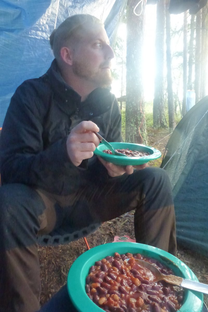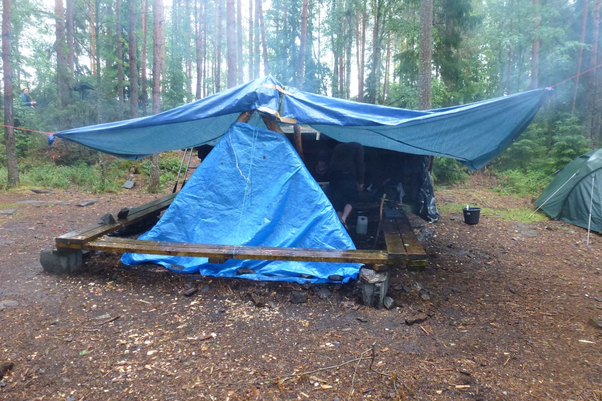 - Erkenntnis 11: Eine Plane zu errichten die gleichzeitig gegen Regen von oben und Wind von zwei Seiten schützen soll, hat schnell zur Folge, dass sich der Qualm an Ort und Stelle sammelt und Atmen sowie Sehen erschwert, da das bereitliegende Holz völlig nass war. Eingepfercht in unserer "qualmenden Schwitzhütte" bekamen wir anfangs nicht mit, dass wir Besuch bekamen, bis der Kopf von jemandem bei uns im „Verschlag“ auftauchte und uns freundlich auf englisch darüber in Kenntnis setzte, dass weitere Menschen angekommen waren, wir uns aber nicht gestört fühlen sollten; die Schutzhütte und die Feuerstelle bliebe gerne für uns.