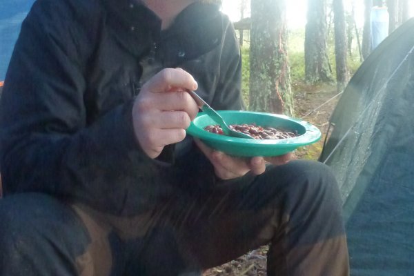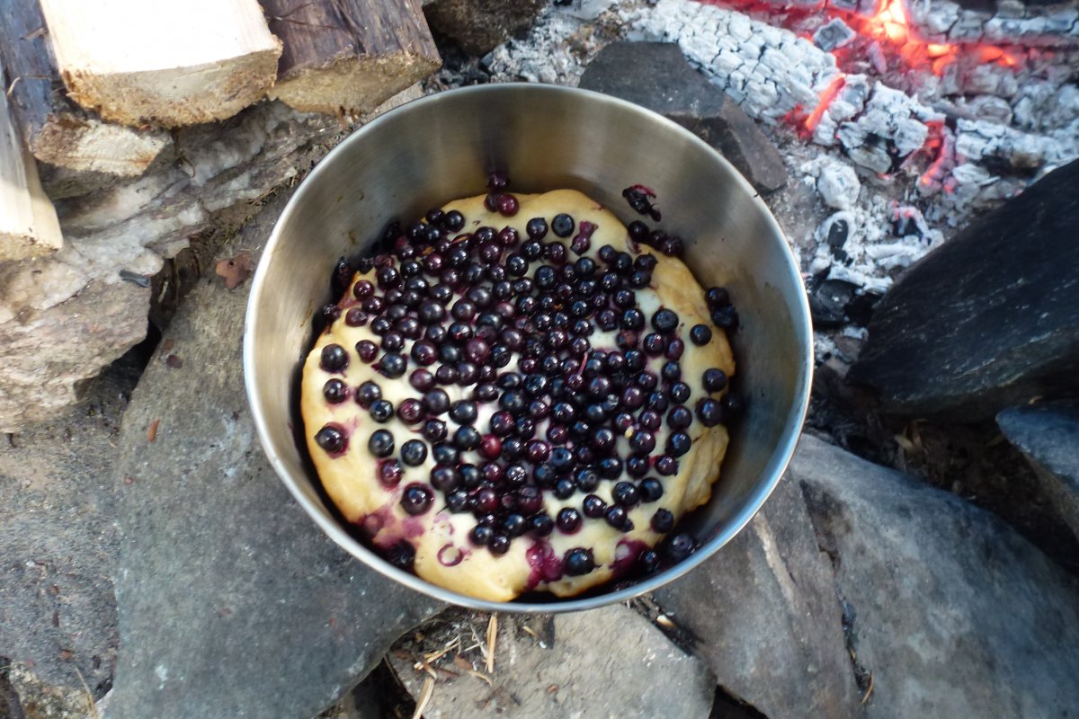 Diese ungewohnte freie Zeit nutzten wir, um wild wachsende Heidelbeeren zwischen Elchkötteln zu sammeln und unser Festmahl vorzubereiten, bei dem wir vier alle Vorräte sichteten die uns nach einer Woche noch geblieben waren um aus diesen Zutaten ein opulentes Mahl für vier Personen zu zaubern, mit einem Heidelbeerkuchen als krönendem Abschluss.