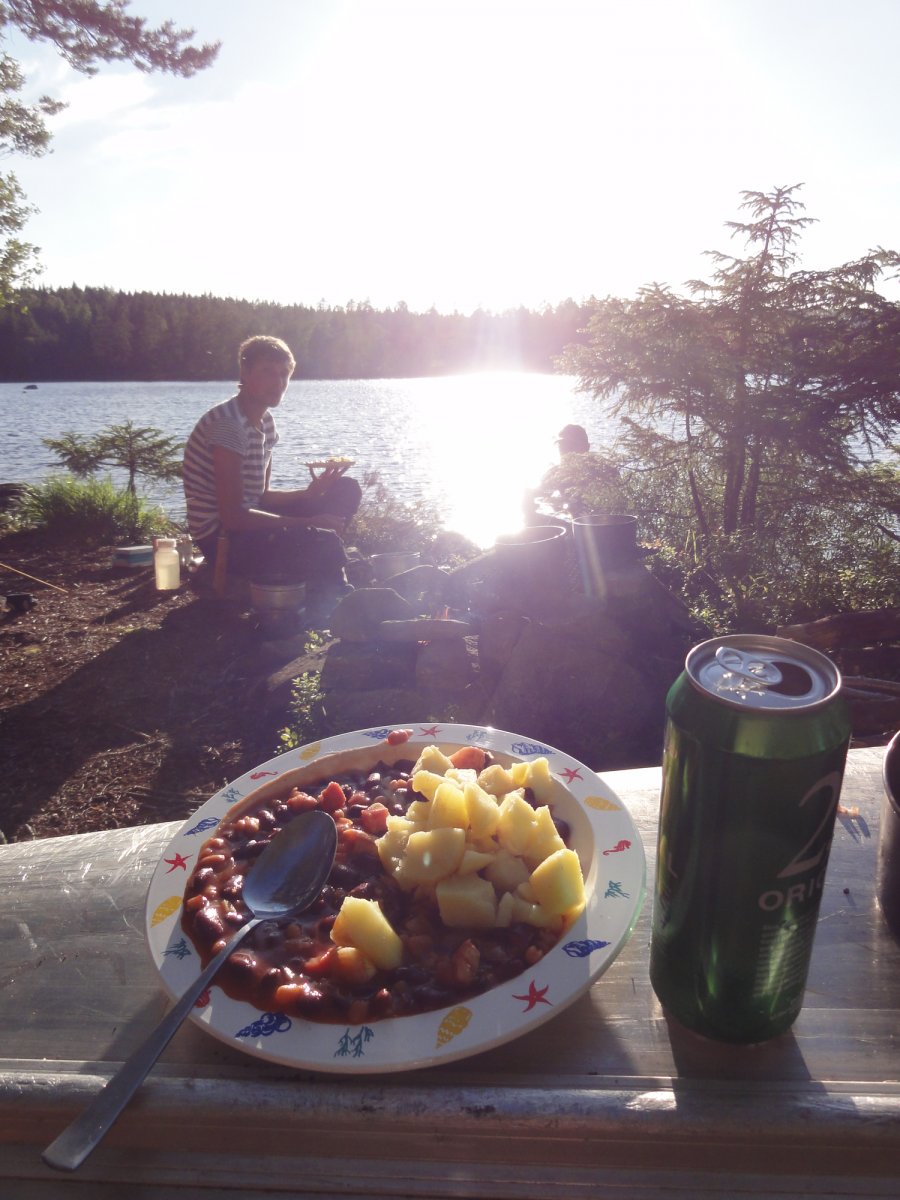 Da wir durch den Anreisetag erst spät auf dem Wasser waren und alle Hunger hatten entschieden wir uns früher an Land zu gehen, das Lager aufzubauen, zu kochen und den Abend zu genießen. Das Highlight des Abends - ach sicherlich des ganzen Tages- war die Terence Hill Pfanne. Nach gefühlten 30h Fahrt und nur 1. 2. Sändwiches war dieses Gericht genau das richtige für den Abend.