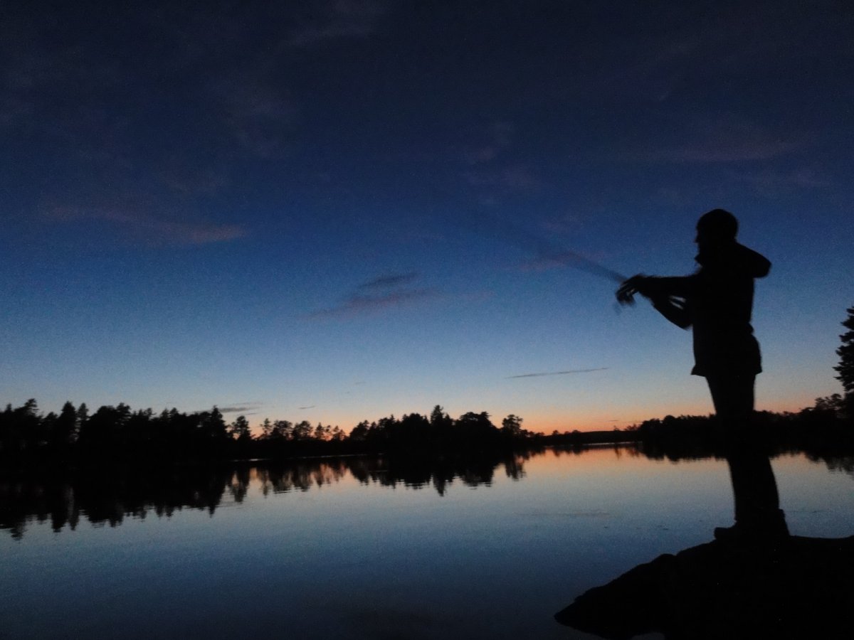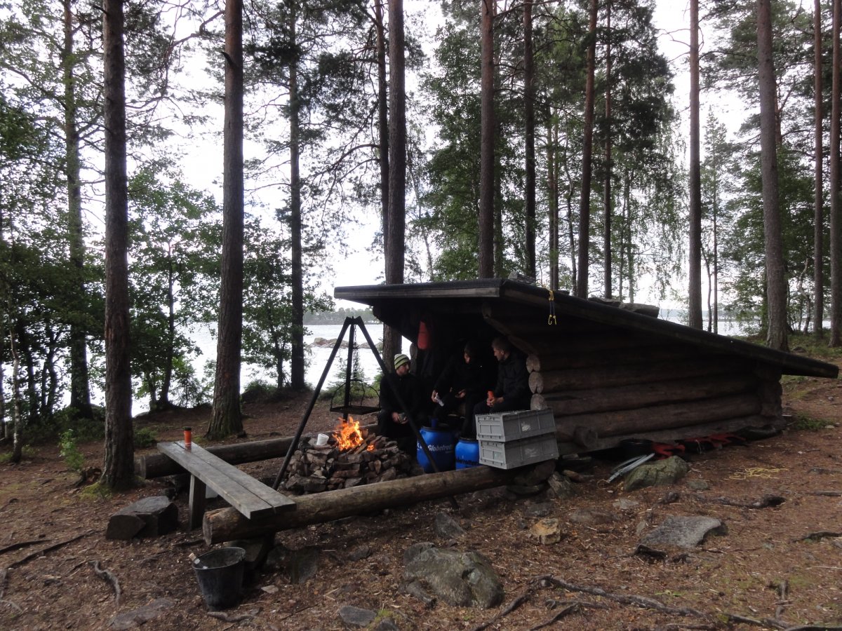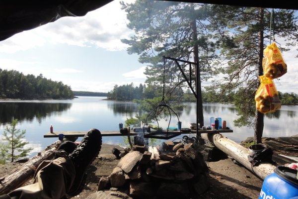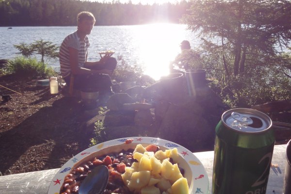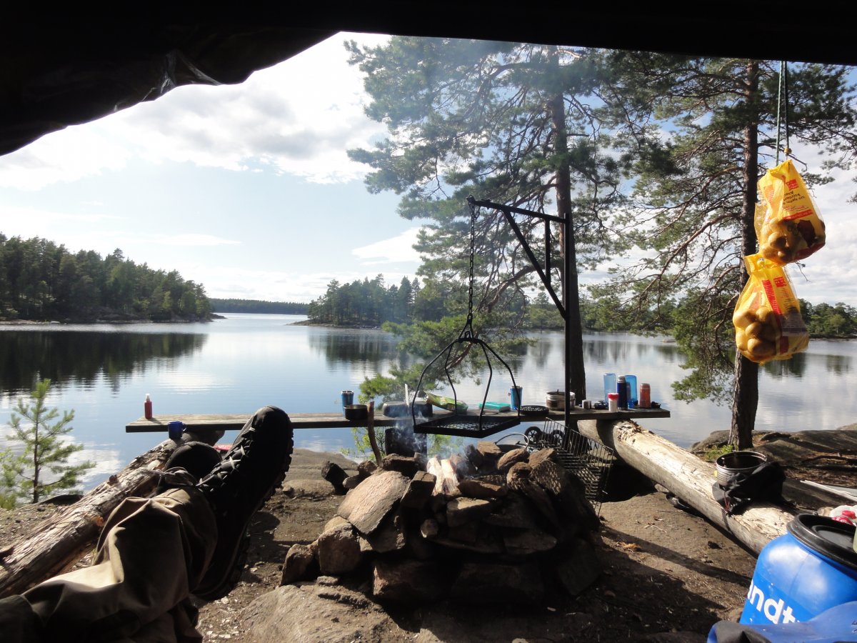 Die weiteren Tage ähnelten sich alle sehr in ihrem Ablauf, wobei jeder Tag für sich bestimmte Highlights hatte. In der Regel folgte nach dem Aufstehen das Vorbereiten des Frühstücks, nach dem Frühstück das Abbauen des Lagers und dann die gemütliche Weiterfahrt mit dem Kanu, wobei wir es hier sehr gemütlich angehen gelassen haben und maximal 4-5h aufm Wasser waren. Dann das Suchen eines neuen Rastplatzes bzw. einer freien Schutzhütte und das Aufbauen des Lagers. Nach dem das Lager wieder vorbereitet war gingen wir meistens auf die Suche nach Pilzen und Beeren oder versuchten unser Glück beim Fischen, sodass dann Abends beim gemütlichen Lagerfeuer ein herzhaftes Essen auf den Tisch kam, das bei gechillter Musik, traumhaften See- und Sonnenuntergangsblick gleich noch besser schmeckte. Die Abende ließen wir meistens mit ein paar Spielen ausklingen oder versuchten abermals noch ein paar Fische zu angeln.