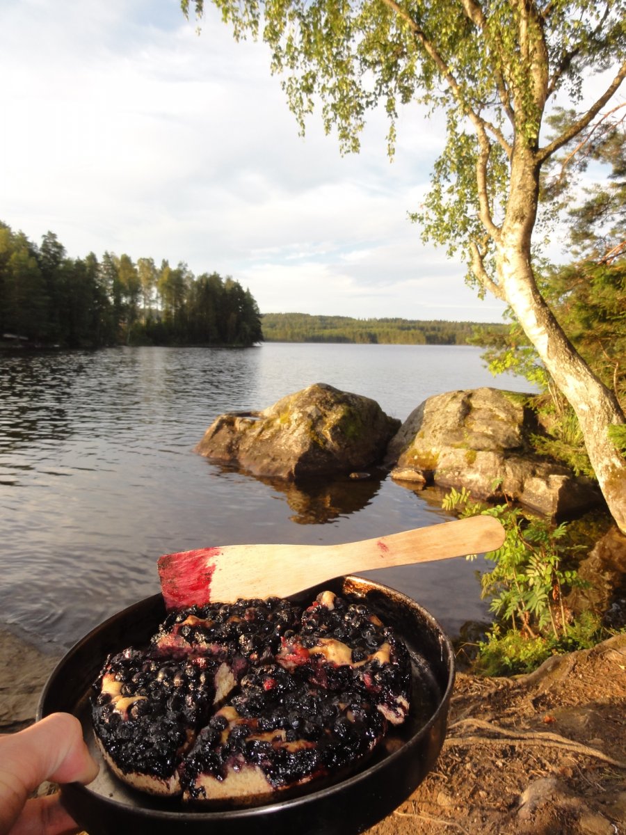 die gesammelten Heidelbeeren machten sich super im Müsli oder Pfannekuchen. Auch den Heidelbeerkuchen aus dem beiliegenden Kochbuch probierten wir aus und versüßten so die täglichen Mahlzeiten. Er ist sogar fast geglückt. Nur der Boden war leider schwarz.