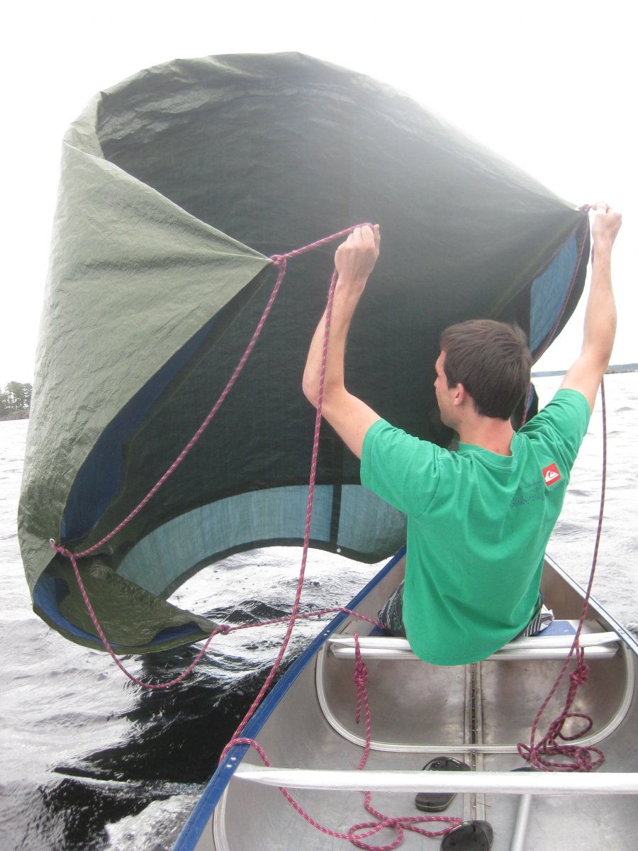 Gab es dochmal einen Moment in dem Wind aufkam versuchten wir unser selbstgebautes Segel zu testen. Aus der beiliegenden Plane und der mitgebrachten Schnur banden wir die Plane vorne am Boot so fest, dass wenn man sie hochwirft und der Wind das Segel fast vom Wind getrieben wird - so die Theorie - und tatsächlich hatten wir bei einigen Versuchen Glück und der Wind war stark genug das Segel auszufüllen und uns über das Wasser zu schieben.