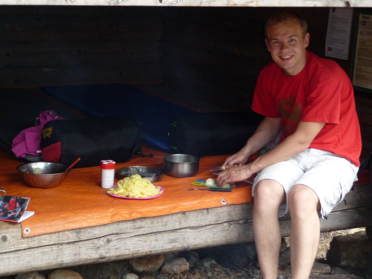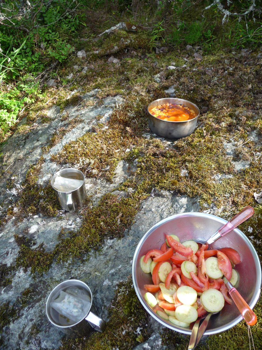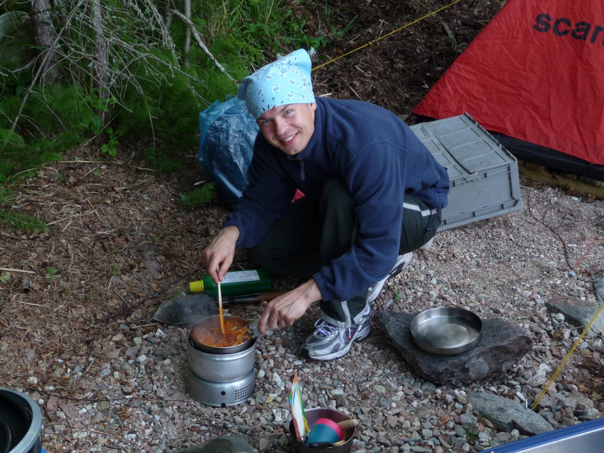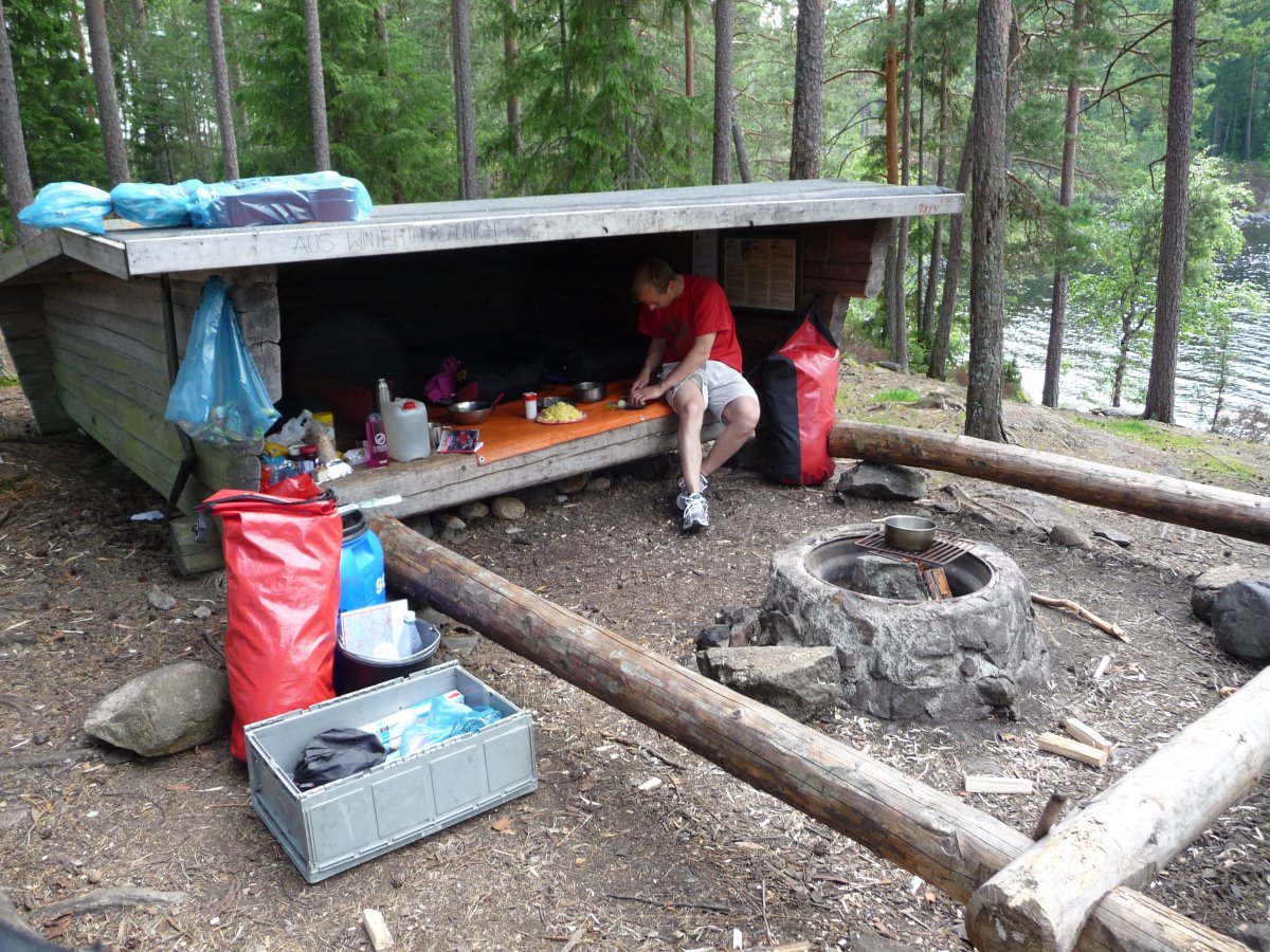 Um kurz nach zwölf sitzen wir im Kanu Richtung norden mit dem Ziel den ersten öffentlichen Rastplatz (Nr. 11 oder 17) zu erreichen. Das Wetter ist einfach bombastisch. Wir haben 24°C, einen blauen Himmel und eine leichte Brise. Da wir unerwartet schnell unser Ziel erreicht haben, beschließen wir weiter Richtung norwegischer Grenze zu der Insel Trollön (Nr. 8) zu paddeln. Auf der Insel angekommen wird als Erstes die Axt ausprobiert, um das nötige Feuerholz für unser erstes Essen am Lagerfeuer zu bekommen. Unser erstes Gericht sind Bratkartoffeln mit Speck /Zwiebeln und ein Gurken-Tomaten-Salat.