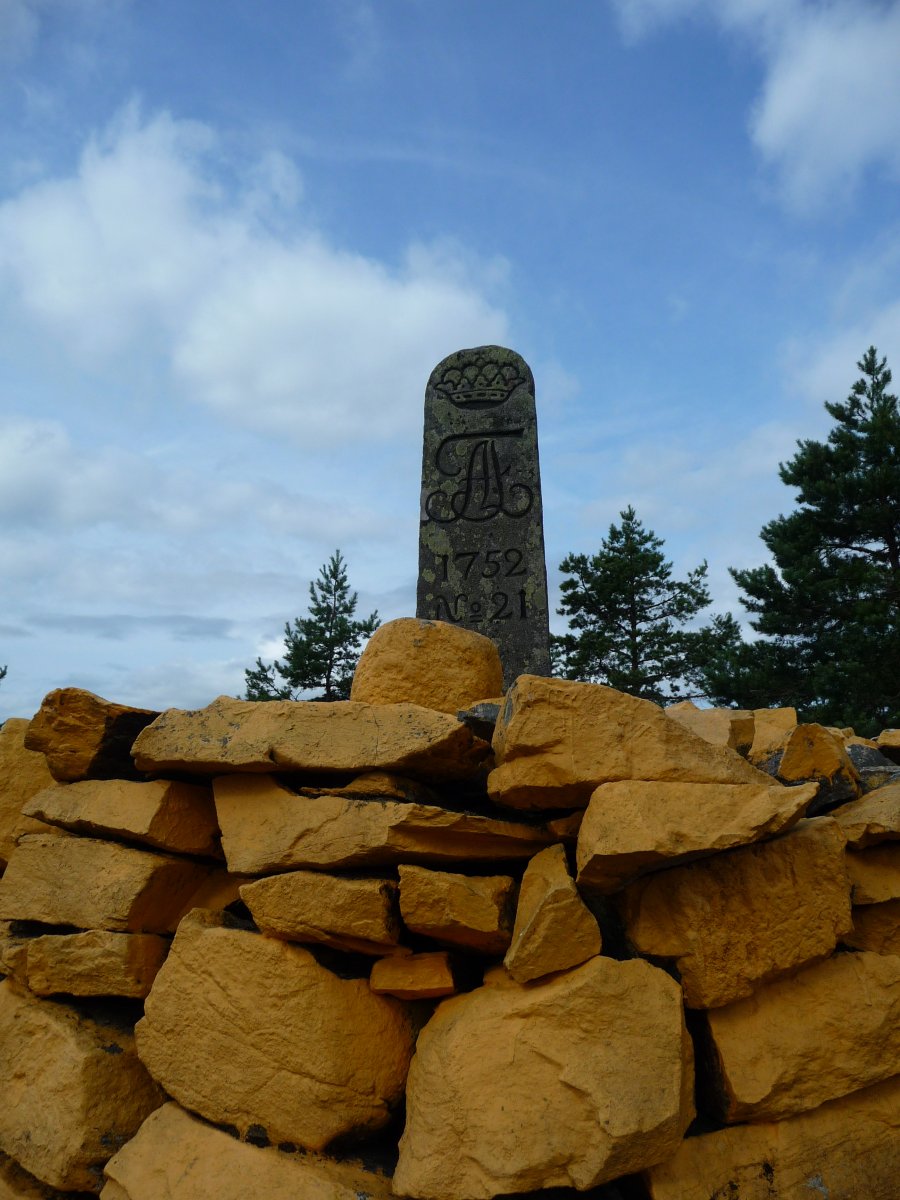 Die erste Nacht in Schweden – die Nächte sind in Juli sehr kurz und es bleibt nur ca. zw. 23 und 2 Uhr dunkel. Nach einem kräftigen Frühstück beschließen wir die Insel zu erkunden. Die Insel Trollön gehört sowohl zu Norwegen als auch zu Schweden. Deshalb entdecken wir einen Grenzpfosten, der im Jahre 1752 aufgestellt wurde.