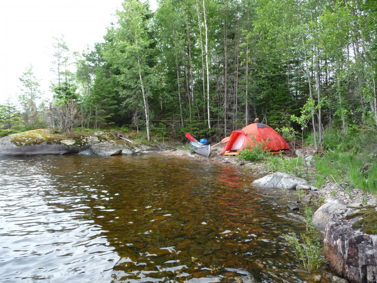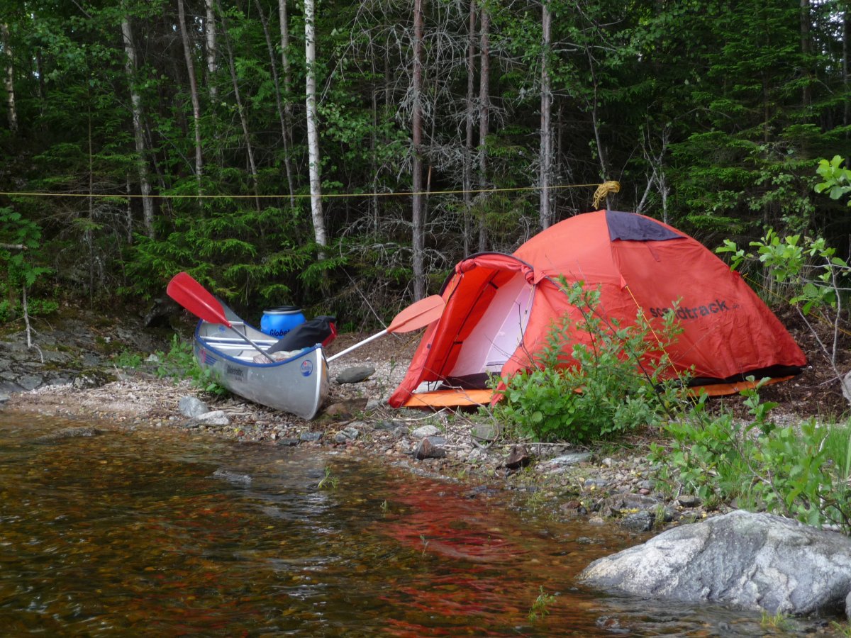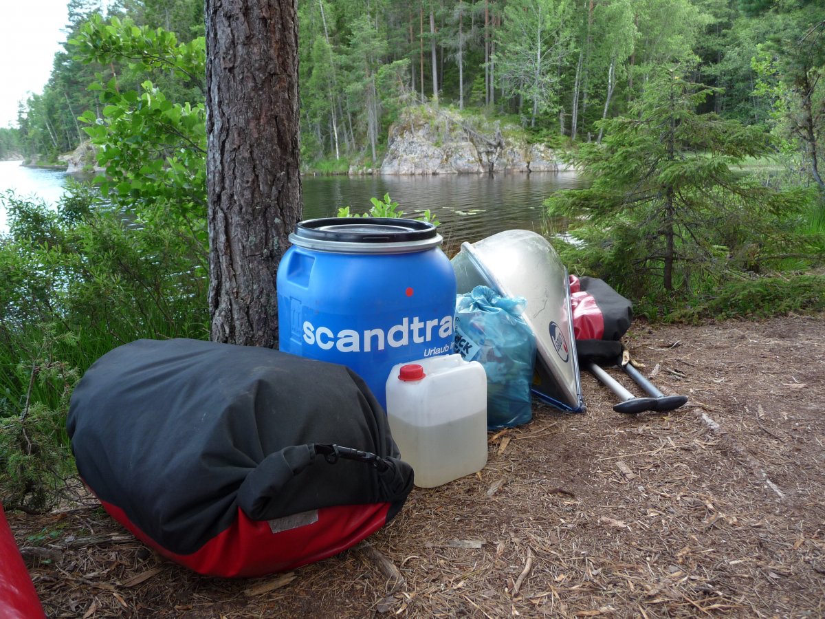 Im Camp angekommen (ca. 11 Uhr), werden wir freundlich von Frank begrüßt und über den weiteren Ablauf informiert. Nach einer kurzen Stärkung (Hotdogs) laufen wir nun durch den Wald (ca. 500 m) zum zweiten Camp, indem die Ausrüstung verteilt wird. Es lohnt sich nicht solange im ersten Camp aufzuhalten, wenn man als Erster aufs Wasser gehen möchte und lange Menschenschlangen nicht mag. Wir kontrollieren die Ausrüstung (wird jedem empfohlen, denn die fehlende Ausrüstung muss man bei der Abgabe selber bezahlen). Alles ist da, wir packen unsere Sachen in Wasserdichtesäcke um und laufen dann mit der Ausrüstung und der blauen Verpflegungstonne (die am ersten Tag noch sehr schwer war) zum Steg (ca. 100 m). Wir haben zwei zusätzliche Wasserdichtesäcke sowie eine zweite Rolle blauer Säcke von zu Hause mitgebracht. Diese haben sich als nützlich erwiesen, um z. B. schmutzige von sauberer Wäsche zu trennen.