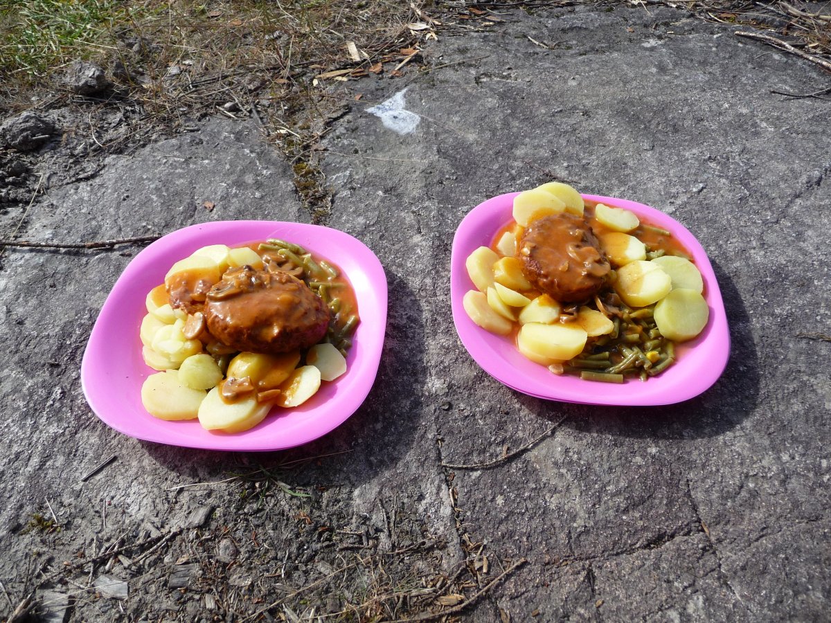 Auf unserem Camp entdecken wir eine Schaukel, die für verspielte Männer für viele glückliche Momente sorgen kann. Heute Abend gibt es Jägerbraten mit gekochten Kartoffeln und Brechbohnen.