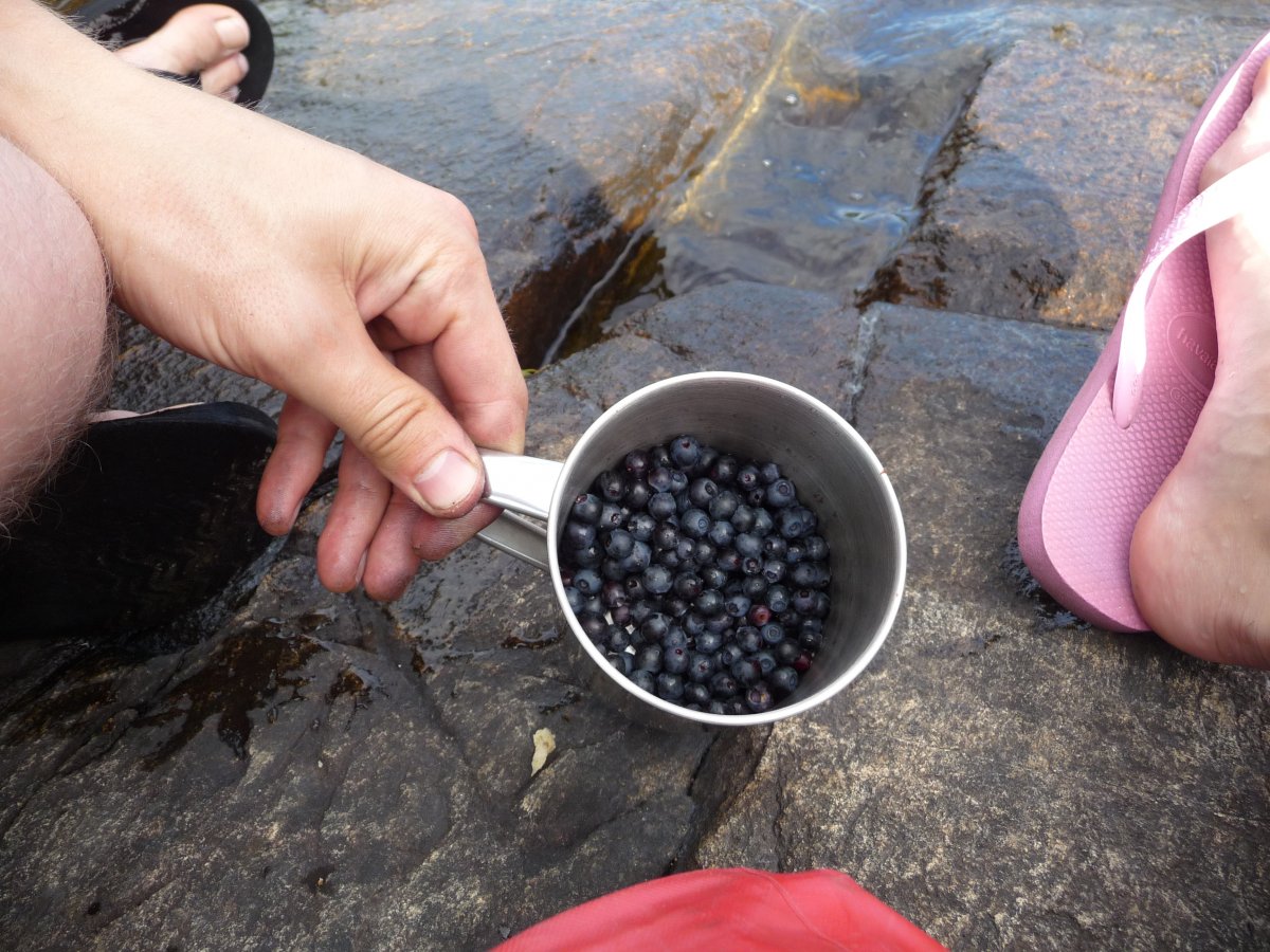 Heute ist wieder sonnig und warm 25°C. Wir fahren zurück Richtung Süden mit dem Ziel den Stora Le zu erreichen. Bereits um halb acht sind wir auf dem Wasser und paddeln fleißig, um unser Ziel zu erreichen. Ich kann nur empfehlen morgens früh zu paddeln. Es ist fast immer windstill, leise und leer auf dem See. Deshalb ist es auch viel entspanter zu paddeln. Nach einer längeren Fahrt erreichen wir den Stora Le und schlagen unser Lager auf einer einsamen Halbinsel kurz vor dem Örtchen Grötnäss. Heute beschließe ich auf die Beerensuche zu gehen und ich werde nicht mit leeren Händen zurückkehren. Ein halber Becher mit Blaubeeren und voller Bauch mit Wilderdbeeren sind das Resultat.