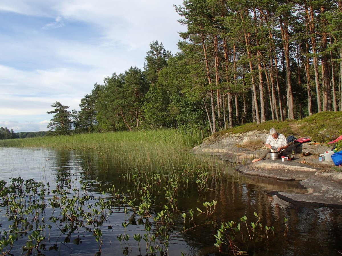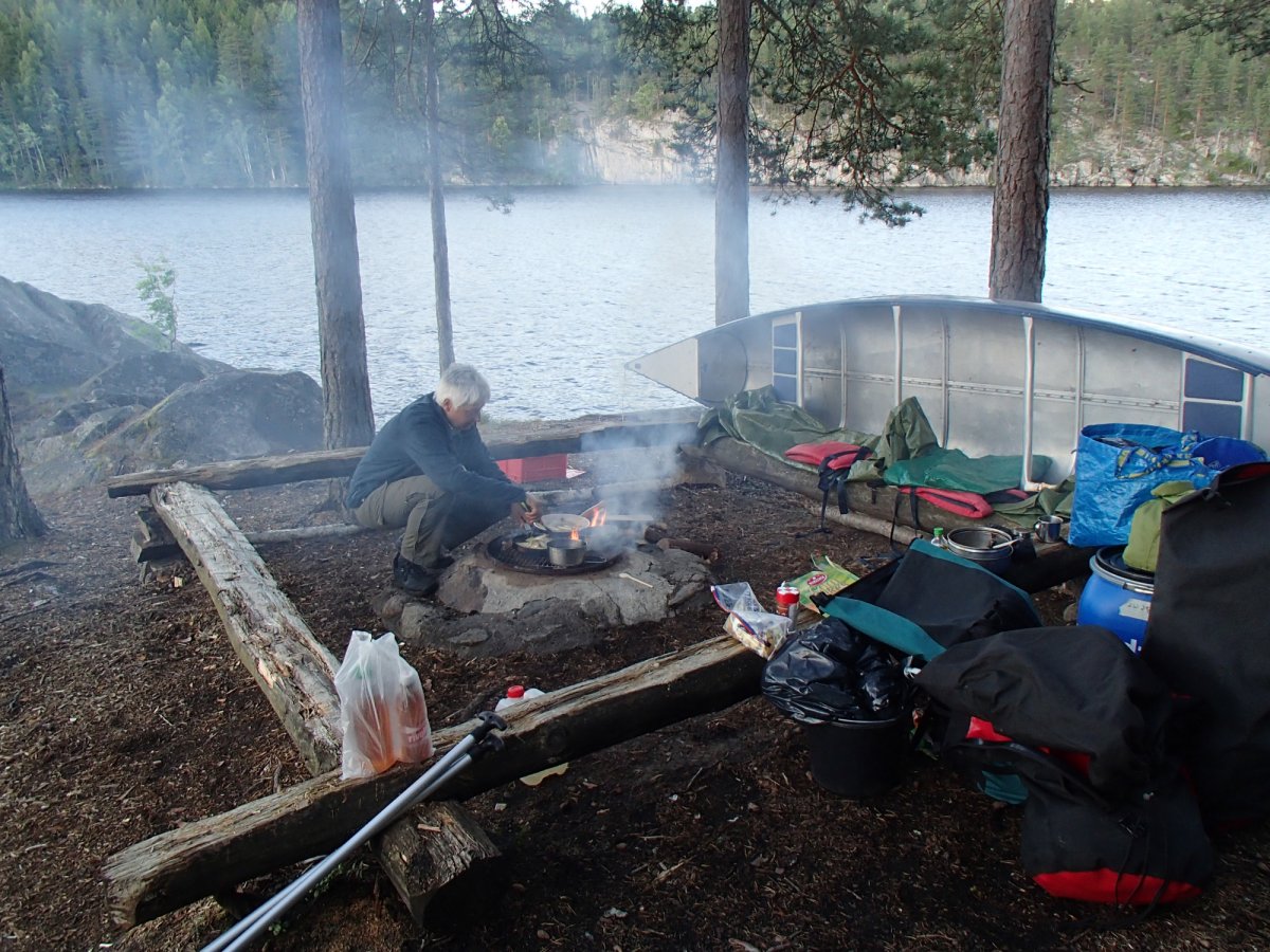 Morgens paddeln wir bei günstigem Wind los und treffen unsere Freude an der letzten Lagermöglichkeit vor der Portage wieder. Sie haben einen Seeadler beim Fischen beobachtet und Pfifferlinge gefunden. Die Portage zieht sich ewig und unser Bootswagen quietscht und ächtzt und ist kaum voran zu zerren. An der Mündung zur Südbucht des Lelang holen unsere Freunde uns ein. Gemeinsam machen wir einen Rundgang zu fünf spätsteinzeitlichen und bronzezeitlichen Hügelgräbern, der hier ausgeschildert ist. Ein Einheimischer, der uns begeistert von den Schönheiten seiner Heimat vorschwärmt verrät uns noch, dass wir an den Felswänden des Nedre Blomsjön Felszeichnungen hätten finden können; zu Hause auf google können wir jedoch nichts ausfindig machen. Mit Rückenwind und Sonnenschein geht es weiter auf dem Lelang nach Süden. An einem etwas windigen Lagerplatz treffen wir die Michelstädter ein letztes Mal, bevor sie zurück nach Norden fahren müssen. Wir haben ja zum Glück noch unsere zweite Woche. Da ich mich nicht fit fühle bekomme ich von Harald Pilzreis als Abendessen serviert. Schön, auch mal bekocht zu werden!