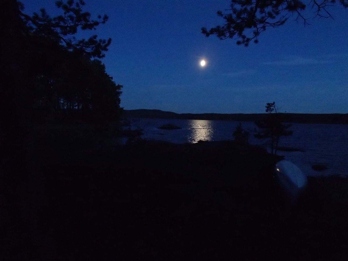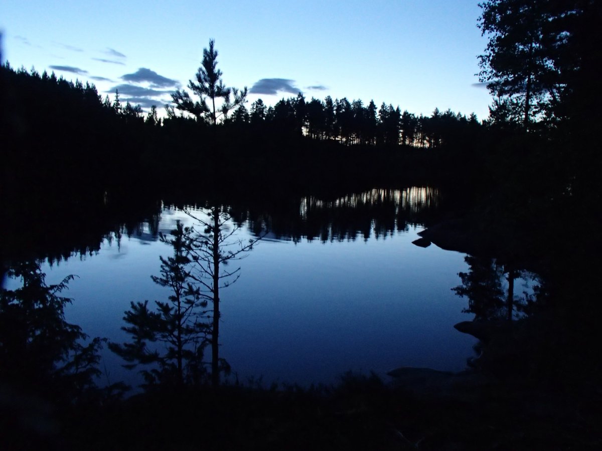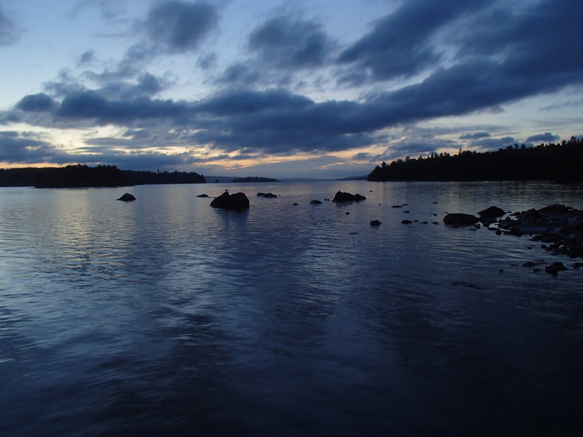 Wie sich herausstellt war es aber die Ruhe vor dem Sturm. Als später ein leichtes Lüftchen die Wellen kräuselt und wir beschließen weiter zu fahren, kämpfen wir schon bald wieder gegen heftige Böen vom See her an. Wir sind heilfroh, den Windschutz kleiner Inselchen zu haben und dann bei Kallarebunäset eine fast von allen Seiten geschützte Bucht mit Platz für genau ein Zelt zu finden. Es wird ein wunderbarer Abschlussabend. Im Feuer verbrennt unser letzter Holzvorrat und in der blauen Nacht scheint ein heller Mond über die Bucht, in der sich Inselchen und Felsspitzen spiegeln. Es wird spät, bevor wir zum letzten Mal in den Schlafsack kriechen.