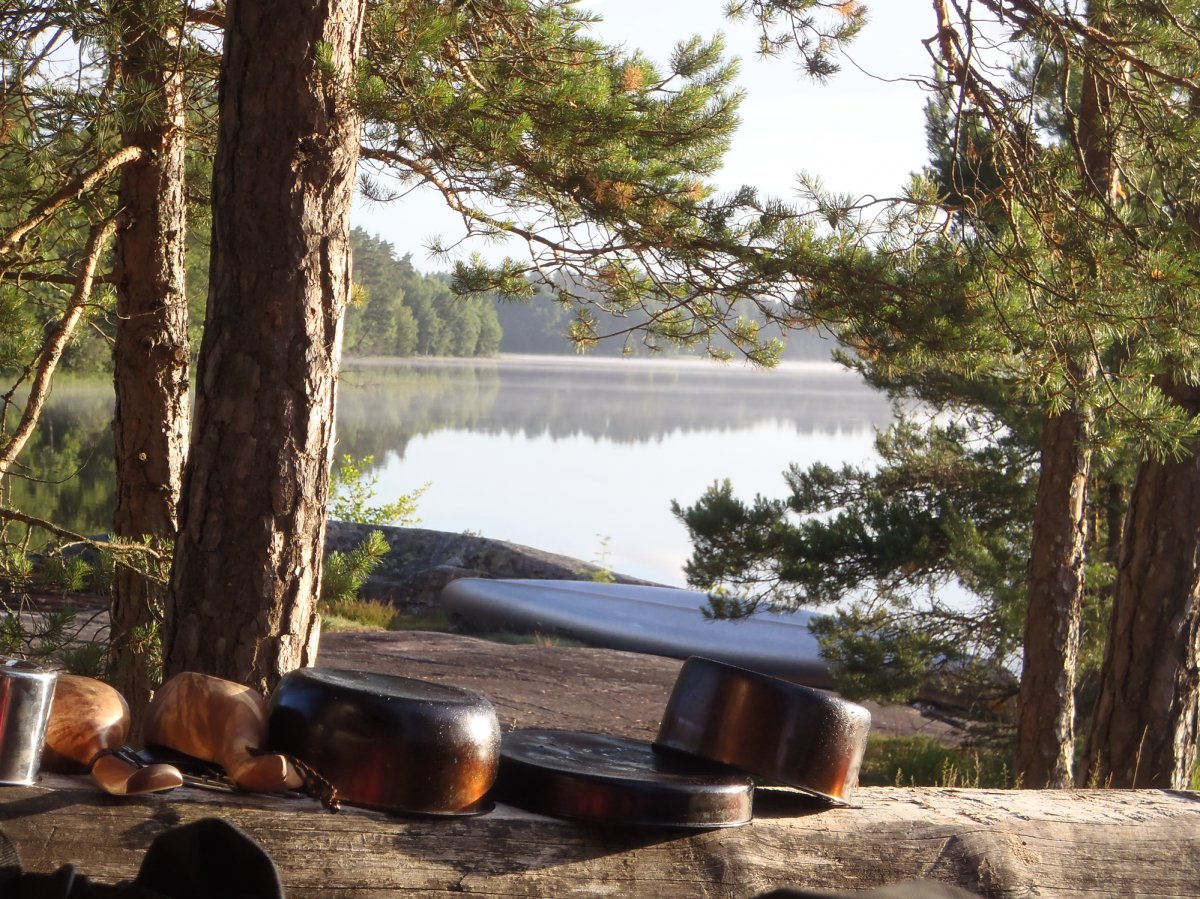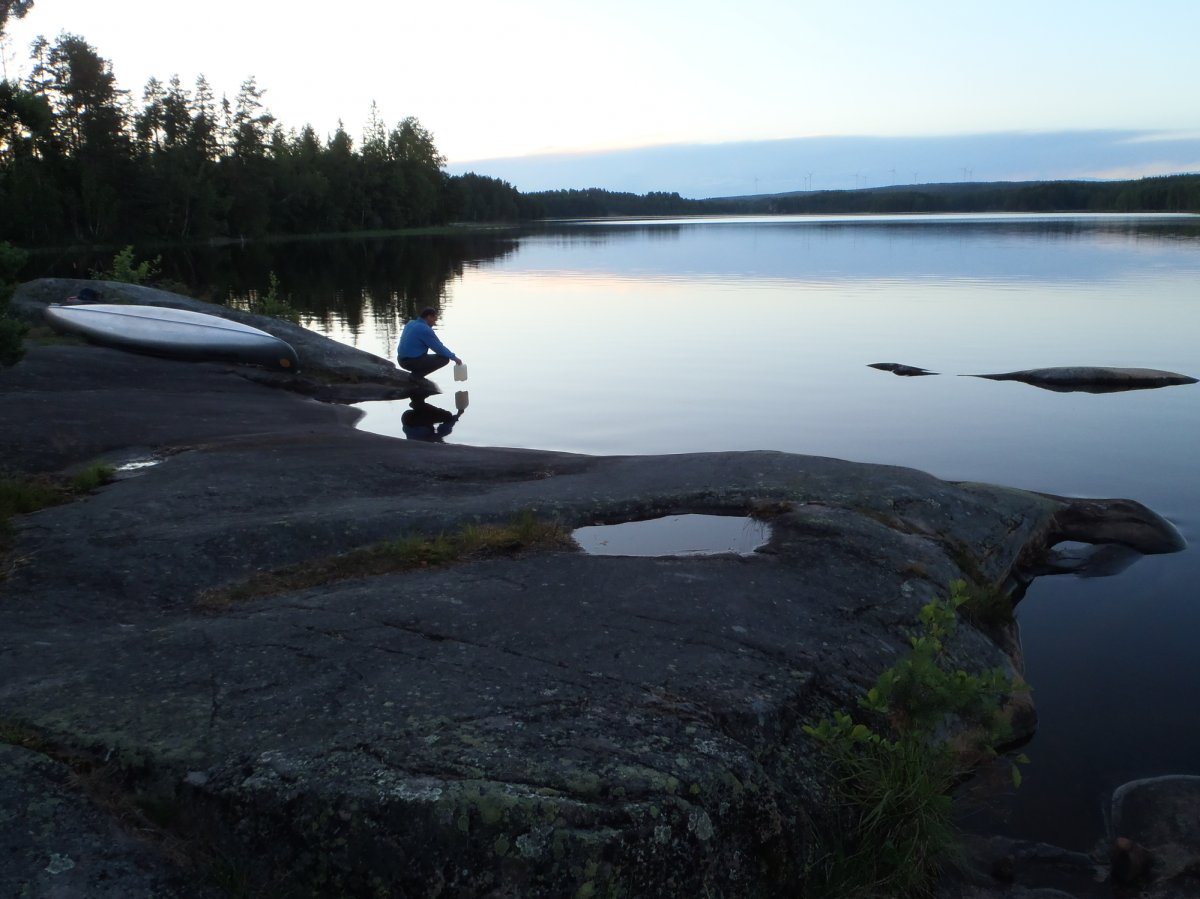 Auf dem Övre Blomsjon angekommen paddeln wir, von der Schönheit der Landschaft getragen, erstmal weiter. Bis wir vor uns den ultimativen Traum-Lagerplatz sehen: Schärenfelsen zum Sonnen, lichter Kiefernwald, ein sonniger und geschützter Unterstand, viel gutes, nicht zu massives, trockenes Brennholz, relativ windgeschützt, in herrlichster Lage. Und wir bleiben allein! Es wird ein perfekter Nachmittag und Abend. Wir schwimmen, springen von den Felsen und genießen später ewig lang das helle Licht der „weißen Nächte“. Es wird still, bis auf die brummenden und klagenden Rufe der Taucher und weit entferntes Geschrei von Kindern, die um 23:00 nochmal baden gehen. In einer Bucht kriechen dann dünne Nebel über das Wasser. Mehrmals in der Nacht wache ich auf, nur weil ich schauen muss, wie schön der See und der Himmel vor dem offenen Unterstand liegen und sich allmählich das Morgenlicht in die Landschaft schleicht.