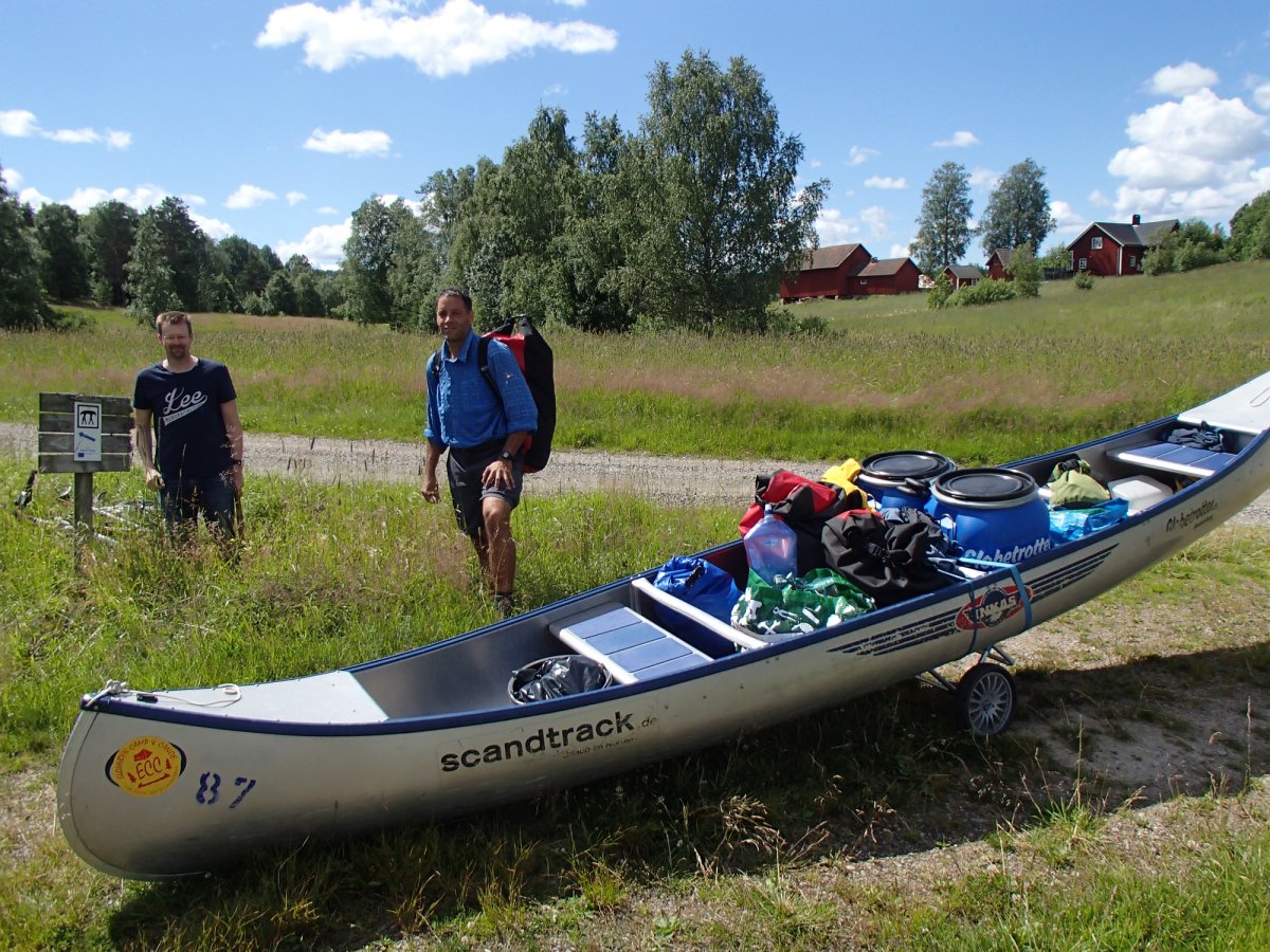 Als wir starten nehmen wir, klug aus Erfahrung, einen Vorrat an getrocknetem Brennholz mit (der uns dann fast die ganze Fahrt begleitet). Wir beschließen, trotz unserer erheblichen Zuladung jetzt zu Beginn der Fahrt, nicht umzukehren, sondern die Portagen zu den Blomsjöns in Kauf zu nehmen. Wir haben zwar keinen Bootswagen gemietet, aber unseren eigenen kleinen von zu Hause mitgebracht. Die Strecke bis zur ersten Portage ist bildschön. Dort angekommen stellen wir fest, dass die Strecke hügeliger, kiesiger, länger und unser Bootswagen kleiner als gedacht sind.... aber es geht. Wanderfahrt mal anders interpretiert! Als wir uns kurz vor Streckenende einen Hügel hinaufgemüht haben macht uns ein Radler darauf aufmerksam, dass wir hier auf dem Holzweg sind. Wie sich herausstellt ist ein Wegweiser umgefallen und im Kraut verschwunden. Der gute Mann kehrt um, fährt nach Hause um einen Schlegelhammer zu holen und stellt den Wegweiser wieder auf. Würden wir sowas bei uns zu Hause auch machen – als Nicht-Bootfahrer?!