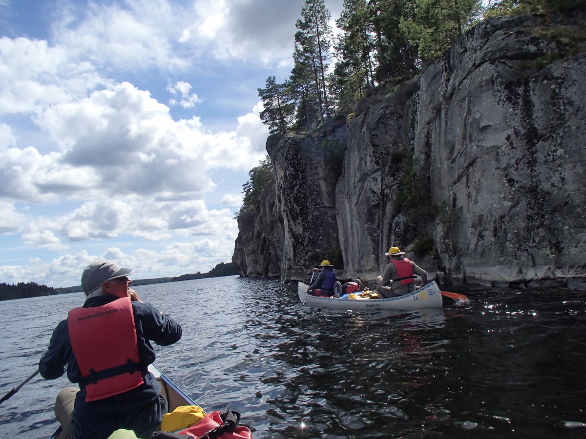 Die nächste Portage ist kurz, aber knackig und wurzelig. Am Nedre Blomsjön empfängt uns Gegenwind. Auf beiden Seiten des Sees sind immer wieder Wände aus hohen, spektakulär glatten Felswänden. Wir fahren jeden Lagerplatz an. Einer, mit toller Aussicht über See und Inseln liegt zu hoch und hat kein geeignetes Brennholz. An den sich anbietenden wilden Plätzen ist immer schon jemand und der nächste Unterstand wird von zwei grantigen Dänischen Kajakern blockiert, die hier noch eine zweite Nacht verbringen wollen. Dort treffen wir auf ein Scandtracker Paar aus Michelstadt und wir beschließen, gemeinsam weiter zu suchen. Aber entweder der Untergrund bietet keine wirklich ebenen Plätze, besteht aus purem Granit oder kniehohen Sträuchern oder es wimmelt von Ameisen, jedenfalls kommen wir zum Südende des Sees und sind noch nicht fündig geworden. Bei dem windigen Ausflusskanal verlieren wir den Anschluss und Harald und ich paddeln zurück zum Eingang eines Nebensees am rechten Ufer. Wirklich finden wir dort auf einer schmalen Halbinsel einen perfekten, geschützten Platz, obwohl ohne nutzbare Feuerstelle (Wind, Ameisenhaufen).
