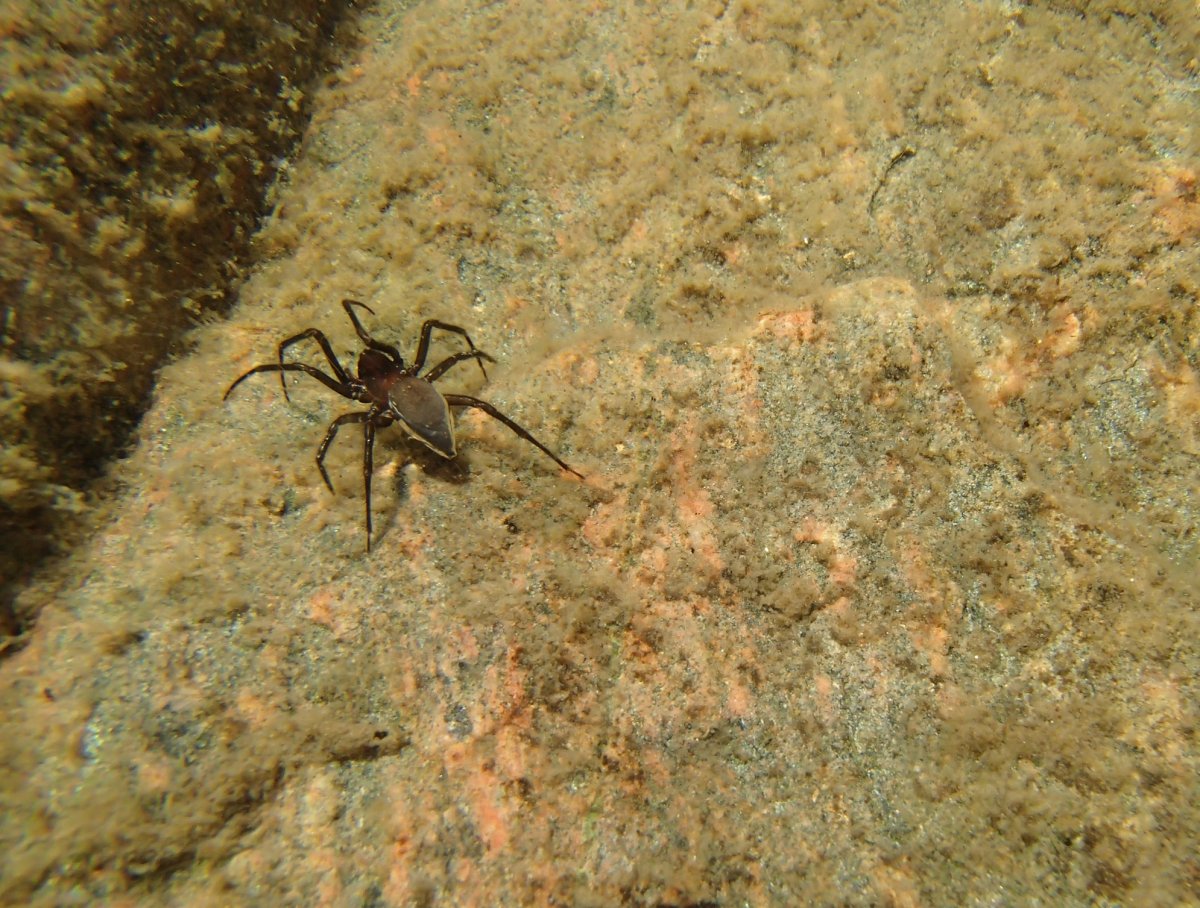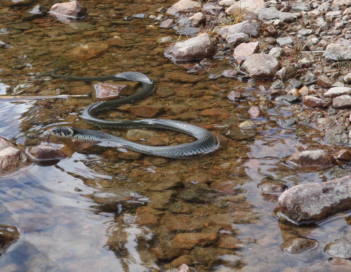 Am nächsten Tag fahren wir auf dem Ö Silen weiter nach Osten und Norden und finden an der Spitze einer Landzunge auf einer Halbinsel einen herrlichen geschützten und einsamen Lagerplatz, obwohl wir Vormittags die ganze Zeit an Horden von paddelnden Jugendgruppen oder geführten Touren vorbei gekommen sind. Aber die brauchen natürlich breite Strände und die Reichweite ist eher begrenzt. Begrüßt werden wir von einer großen Ringelnatter, die sich entlang der ungestörten Uferfelsen jagend durchs Wasser schlängelt. Sie läßt sich eine ganze Zeit lang beobachten. Beim Schwimmen gehen sehen wir in Ufernähe unter Wasser eine Spinne. Bein genauerer Betrachtung ist es eine Wasserspinne (zur Erinnerung: alte Filme im Bio-Unterricht), die an dem Haarpelz um den Unterleib eine dünne Hülle aus Luft zu ihrer - wahrscheinlich unter einem Felsvorsprung befindlichen – Taucherglocke transportiert. Schon irgendwie kurios! Der Ringelnatterfelsen wird unsere Schwimmstelle.