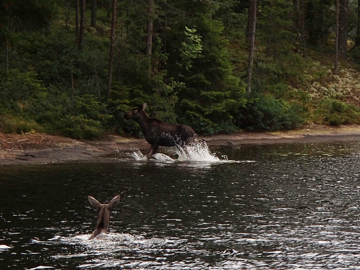 Am nächsten Tag haben wir mal wieder Gegenwind. Um ihn zu vermeiden, fahren wir die ganze Küstenlinie mit allen Buchten aus. Bei Gustavsfors müssen wir schleusen, aber danach wissen wir noch von unserer Herfahrt einen guten Lagerplatz mit Schärenfelsen, Feuerstelle, Blaubeeren und geschnitzter (Meer?)Jungfrau. Ich gehe zum Birkenrinden-Zunder-Sammeln, als es am Ufer rumpelt, kracht und klatscht.. Nein, keine groben Kanufahrer sondern ein Elch ist an, bzw. abgelandet. Er schwimmt durch den schmalen Seearm. Während er am anderen Ufer nachdenklich herum steht, hole ich Harald. Die Elchkuh ist mittlerweile ziemlich vom Gebüsch verdeckt, aber es kommen zwei weitere aus dem Wald, die zielsicher hinüber schwimmen. Drüben kehrt eine um, stürzt sich erneut ins Wasser und schwimmt zurück. Schwimmunterricht? Egal, jedenfalls eine super Vorführung. So kommen wir sogar noch zu echten Elchfotos. Wer hätte das je gedacht?! Kurze Zeit später landen drei Kajakfahrer aus Karlsruhe an, die uns heftig um unser Erlebnis beneiden. Später noch ein Segelschiff. Aber die halten auf Distanz. Ganz anders die drei lustigen Kanuten: wir laden sie ein zu unserem Lagerfeuer und hier trinken wir auf Brüderschaft – mit einer Blutkonserve! Nein, im Original war es ein Plastikbeutel voller gutem, süffigen Rotwein, die ganze Strecke mitgefahren aus den Elsaß! Prost!