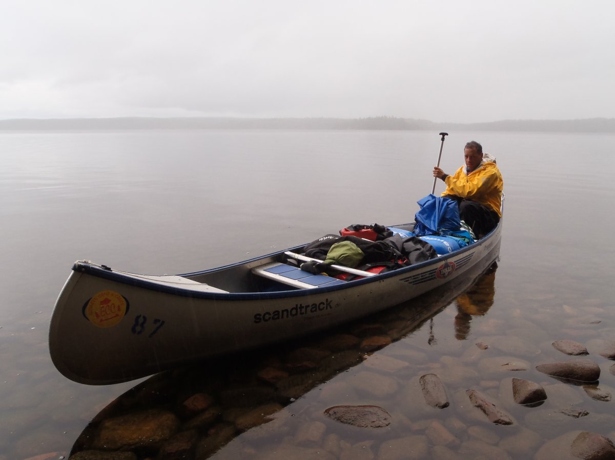 Nach diesem tollen Auftakt und nachdem sich das Mega-Regentief gerade jetzt verabschiedet stürzen wir uns in die Packerei. Die Vorräte für zwei Wochen sind umfangreich. Da nach Ende des Regens nun der Wind immer stärker und auch der Betrieb auf der Wiese immer mehr wird vertrauen wir auf die Expertiese der freundlichen und geduldigen Scandtrack-Mitarbeiter, beladen den uns zugewiesenen Alu Canadier (Zelt und Schwimmwesten haben wir schon auf Schäden kontrolliert und auch ausgetauscht) und starten. Wir haben zwar sowohl Canadier- als auch Wildnis- und Schwedenerfahrung, aber diese Gegend und dieses Boot sind uns noch unbekannt. Da wir kein festes Ziel haben, lassen wir uns von dem fulminanten Wind nach Norden jagen. Wie Anfänger damit zurecht kommen sollen ist uns allerdings ein Rätsel. Nachdem wir etliche ge gegen den immer stärker werdenden Wind um ihre Rückkehr kämpfende Teams, manche zu kippstabilen Katameranen zusammen gebundene Teams und eine Gruppe, die erst gar nicht aus Ihrer Bucht herauskommen zu können scheint, passiert haben fragen wir uns schon, was passiert, wenn man es nicht zurück schafft. Und ob dieser Wind hier Standard ist. Der wird immer stärker, sodass der offene See voller Schaumkronen ist. Zuerst singen wir noch Seemannslieder während wir auf unserer Bahn dahin sausen, aber allmählich bekommen wir Sorge, dass die Wellen zu hoch werden für unser doppelt schwer beladenes Boot. Rückenwind ist eine feine Sache, trotzdem flüchten wir mit unserem tief im Wasser liegenden Boot in den Windschatten der vielen kleinen Inseln und Buchten. Durch die Lücken pfeift der Sturm immer noch ziemlich heftig. Unter diesen Umständen beschließen wir Richtung Flöte-Fjorden zu fahren und den zeitlichen Vorteil unseres frühen Starts und des Windantriebs zu nutzen.