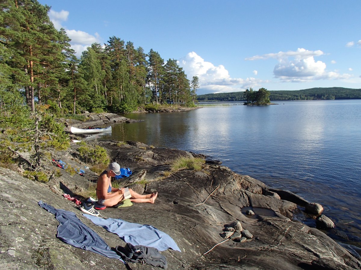 In der Früh werden wir wieder von Gegenwind empfangen. Ausgerechnet auf diesen langen Schlussstrecken nach Norden muss der Hauptwind drehen und uns entgegen blasen! Nur Möven und Seeschwalben scheinen das zu genießen. Unser Mindestziel ist die Insel Bratnäsön, wo wir einen guten Lagerplatz zu finden hoffen. Windgeschützt und sonnig ist aber eher rar. Wir finden einen guten Platz, der bis zum frühen Nachmittag Sonne hat. Ein Luxusplatz, es gibt nicht nur eine Feuerstelle, sondern auch einen niedrigen Steinzeit-Tisch aus einer großen Steinplatte mit Sitzbänken. Zum Mittagessen kochen wir uns eine große Pilzpfanne auf dem Feuer, bei dem wir einen Teil des bisher mitgeschleppten Brennholzvorrats verfeuern. Schließlich ist die nächste Nacht leider schon die letzte Zeltnacht dieses herrlichen Urlaubs. Wegen des starken Gegenwindes haben wir aber auch schon überlegt, diesmal in der Nacht zu fahren, weil der Wind dann meistens nachlässt. Wir wollen so viel Strecke wie nur möglich machen, damit wir es am letzten Tag auf alle Fälle bis um 14:00 Mittags zum Scandtrack-Camp bei Lennartsfors schaffen. Da werden unerwartet Wind und Wellen allmählich weniger und wir beschließen gleich weiter zu fahren. Wenig später liegt die weite Seefläche spiegelglatt da und der Himmel über uns ist blitzblau. Es ist ein Genuss, die Spur unseres Kielwassers mitten über die breiteste Stelle des langen Sees zum Ostufer hinüber zu ziehen. Der Blick nach Norden und Süden ist großartig. Das Gegenufer läd mit Schärenfelsen und Inselchen geradezu zum Baden und Lagern ein. Wir lassen Strecke Strecke sein und verbringen einen herrlichen Badenachmittag wie in der Südsee auf den Seychellen. Nur dass keine Nüsse vorbei schwimmen.