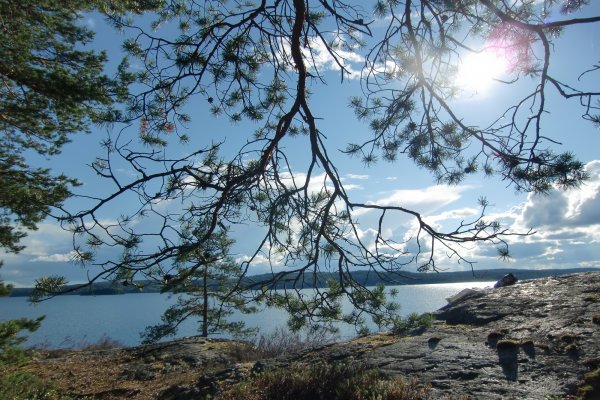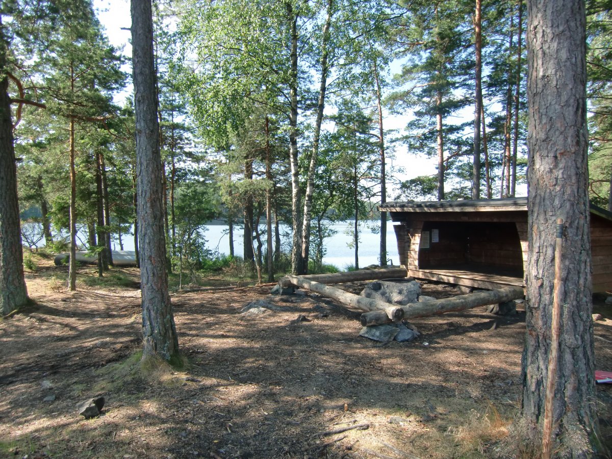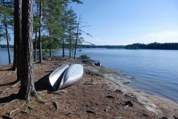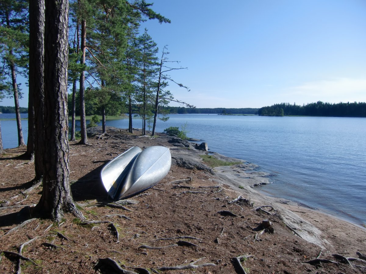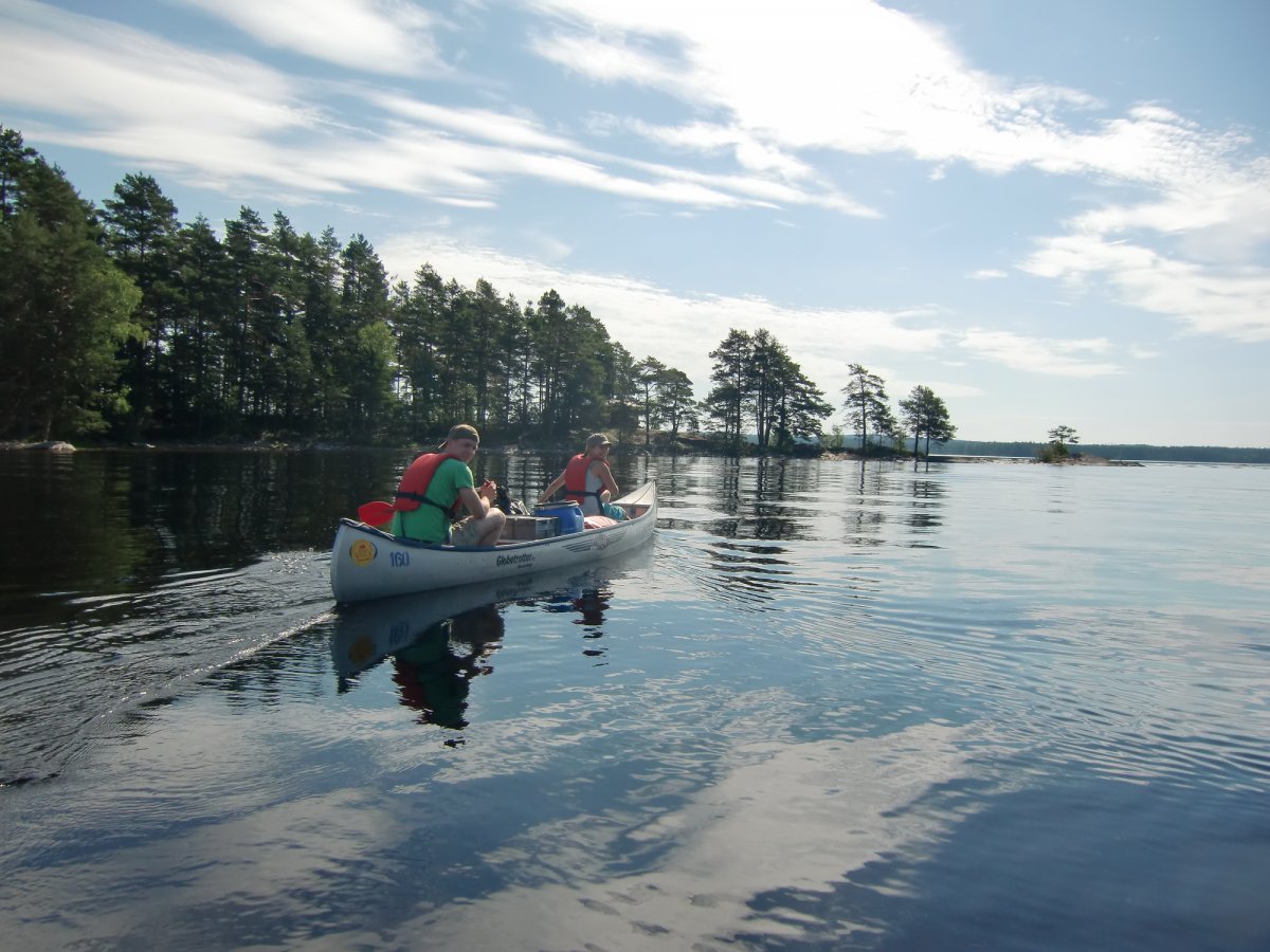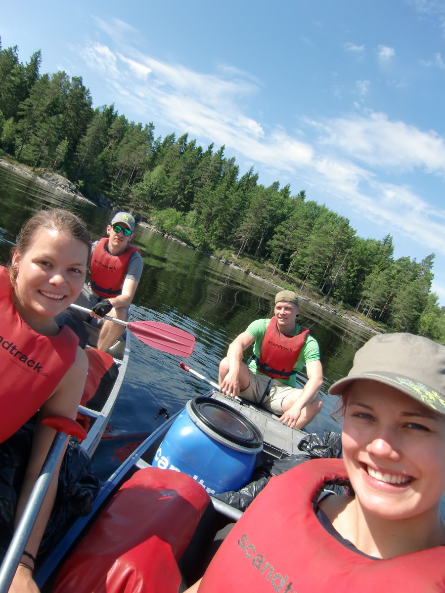 Nach einer kurzen Kanueinweisung ging es endlich los. Erst mal haben wir beide Kanus beladen, bevor es raus auf den See ging. Die Essenstonnen waren sehr schwer. Zum Glück wurden die von Tag zu Tag leerer und somit leichter. Das erste Ziel war für uns die Insel Trollön, die zur Hälfte auch in Norwegen liegt. Obwohl wir alle Anfänger im Paddeln waren, hatten wir den Dreh schnell raus.