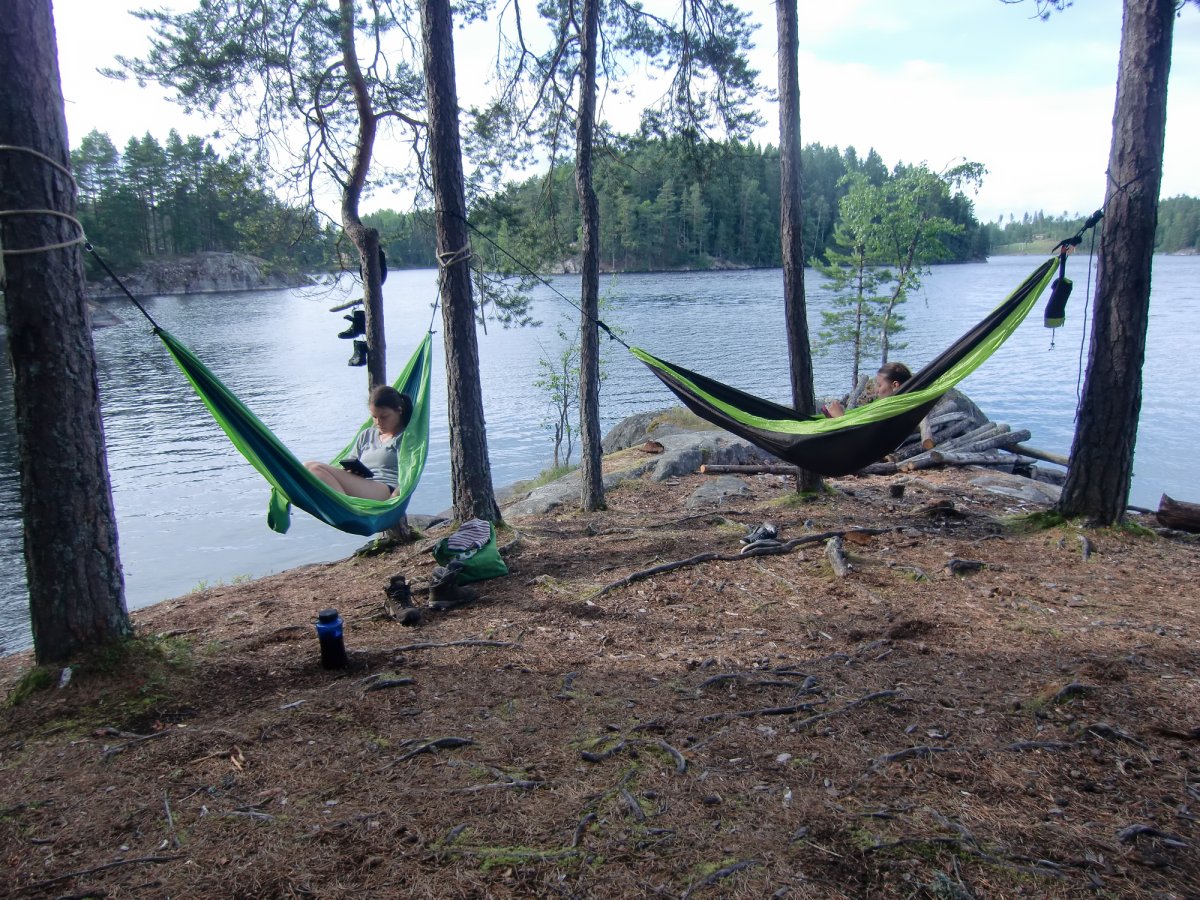 Nachdem wir auf dem ersten DANO Rastplatz ankamen, bauten wir unsere Zelte und das Lager auf. Da das Wetter viel Wind und niedrige Temperaturen mitbrachte, haben wir uns jeden Tag ein Windschutz aus den Planen des Ausrüstungspackets gebaut, was sich immer als sehr hilfreich erwies. Die Rastplätze sind gut ausgerüstet. Die Plätze und Inseln glichen keiner der andern und waren super schön. Jede Insel hatte kleine Buchten, Strände oder hohe Klippen. Die Hütten waren gut zum untersitzen und für die Ausrüstung zu lagern. Die Toiletten waren halb so schlimm wie erwartet. Nur an den betonierten Feuerstellen vor den Hütten war Feuermachen erlaubt, daher übernachteten wir fast jeden Tag an den eingezeichneten Rastplätzen. Leider waren an ein paar Abenden bereits die Hütten belegt. Wir fanden jedoch immer eine weitere Feuerstelle auf der Insel wo wir dann unser Lager aufgeschlagen haben. Auch war an jedem Rastplatz genug Feuerholz vorhanden. Zum Glück hatten wir die Jungs dabei. So konnten wir denen entspannt beim Holz hacken zuschauen. Widererwarten gab es fast keine nervigen Mücken (vermutlich weil alles nach Qualm vom Feuer roch). Wir hatten selber noch Tütensuppen, Müsliriegel und Hefe mit.