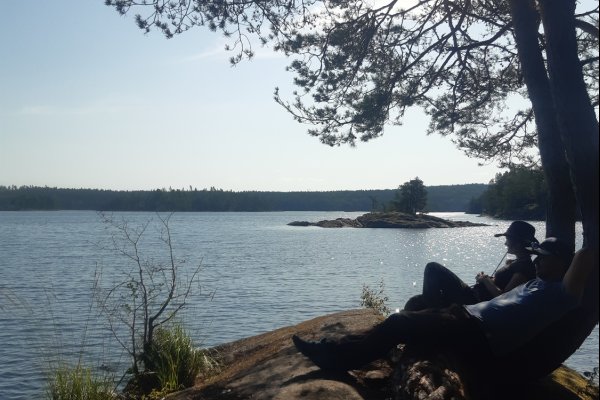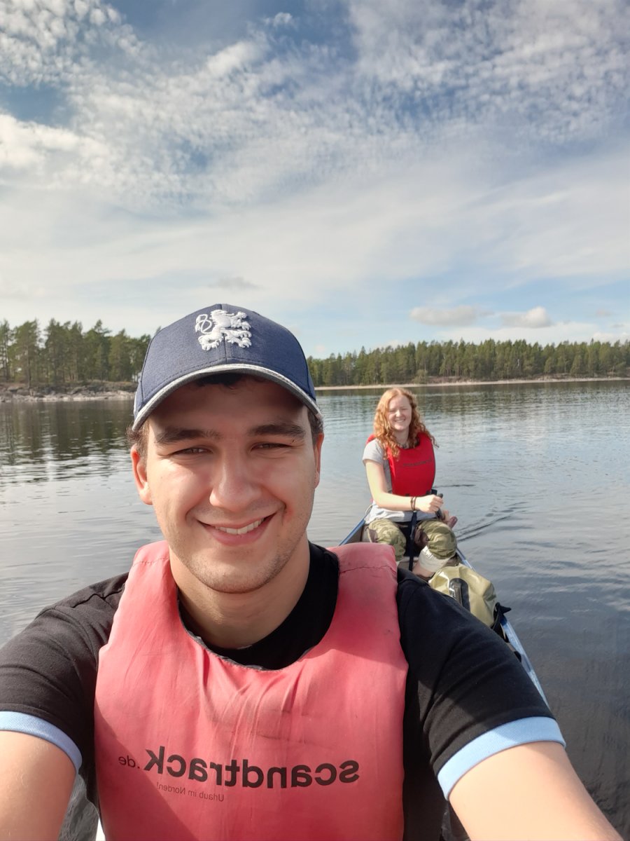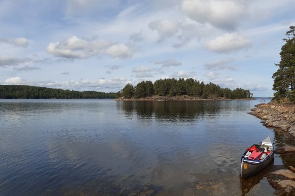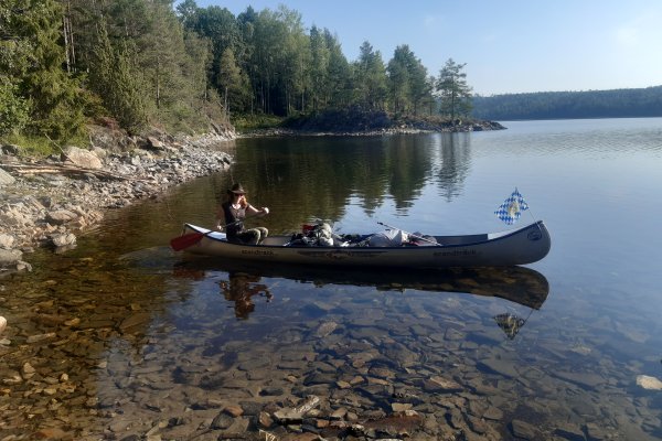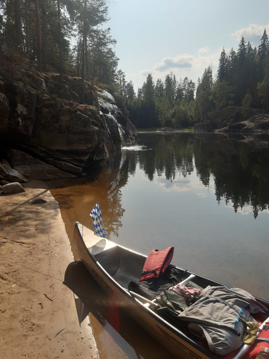 Als wir dann am Camp sehr freundlich begrüßt worden sind, unsere Ausrüstung bekamen und diese ihn unser Kanu verstauten, ging es auch schon auf in unser Abenteuer. Das Wetter war sonnig und unser Ziel war gleich Richtung Norwegen (mit dem Gedanken waren wir nicht allein :-)