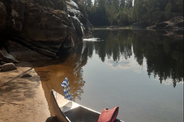 Der vierte Tag war wohl der heißeste Tag. Wir dachten schon wir hätten uns vielleicht in den warmen Süden verirrt. Wir fuhren schon früh los und machten eine längere Mittagspause incl. Abkühlung im See. Anschließend überquerten wir bei Töchsfors den See und erkundeten eine Bucht mit einem wunderschönen Wasserfall und Sandstrand.