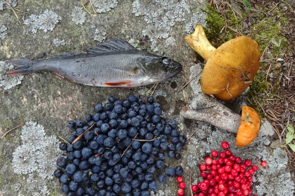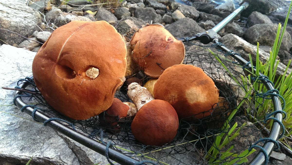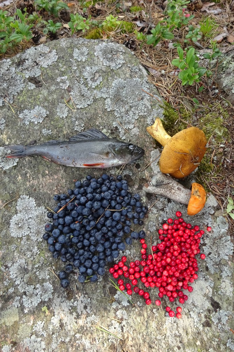 An der Hütte machte ich vom gestrigen Barsch, den beiden Pilze, den Blaubeeren und den Preiselbeeren ein Gruppenfoto.