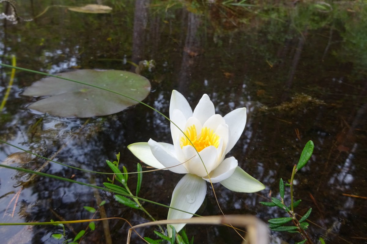 Mit jedem Meter, den wir uns von der Wendeschleife entfernten, fühlten wir uns unwohler. Dies war kein Wanderweg, eigentlich überhaupt kein Weg. Er könnte uns sonstwohin führen. Vom Ziel waren wir nur etwa einen halben Kilometer Luftlinie entfernt, aber das unwegsame Gelände multiplizierte die Wegstrecke. Ich ließ den Jungen zurück und stieg auf einen bemoosten rutschigen Felsen, in der Hoffnung, dort einen Ausblick zu erlangen. Oben angekommen war die Sicht bereits nach 20 Metern durch weitere baumbestandene Felsen versperrt. Ich kletterte herunter und rief den Jungen. Einmütig gaben wir unser Vorhaben auf, gingen den Weg schweigend zurück. Da schimmerte links durch einen Birkenhain eine schwarze glatte Teichfläche. Dorthin schlugen wir uns durch. Eine zarte einsame Seerose entfaltete im flachen Wasser ihre Schönheit. Für wen, wenn nicht für uns? Der Sohn machte ein Foto und bezahlte mit weiteren dicken Quaddeln an den Knöcheln.