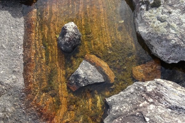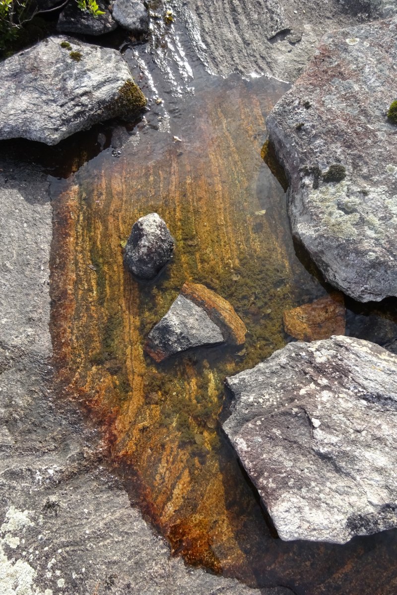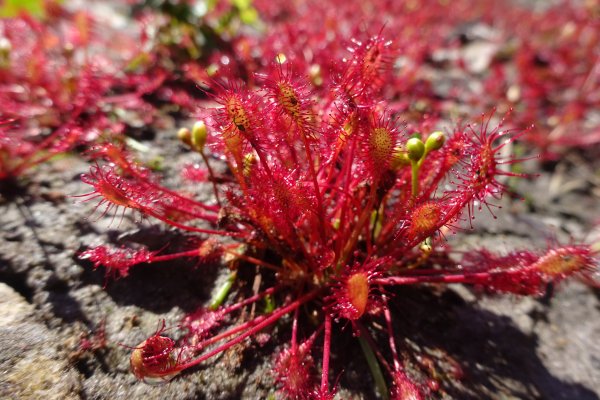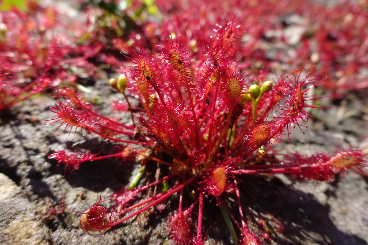 Und dann gab es auf unserer Insel noch eine botanische Besonderheit, die wir anfangs fast übersehen hätten: Ein etwa 100 Quadratmeter (10x10 Meter) großes Habitat von „Drosera Intermedia“. Diese Pflanze frisst Fleisch, - zwar keine Menschen und Säuger, aber immerhin Insekten. Die Exemplare, mit der wir die Insel teilten, waren fettgefressen. Das lag am idealen Standort. Hier gab es nicht nur staunassen Boden in praller Sonne, sondern es wurde das nach Süden hin ausgerichtete Revier links und rechts von Felsen begrenzt. Niedrig fliegende Insekten wurden durch diese Anflugschneise direkt auf das mit weißen Blüten lockende Feld hineingelotst. Es war gruselig: Überall klebten die Opfer in diversen Zersetzungszuständen an den Drüsenhaaren der Pflanzen. Und hätte der Wind auch nur für eine Minute sein Säuseln eingestellt, dann wäre die Luft vom Schmatzen der Pflanzen erfüllt gewesen.