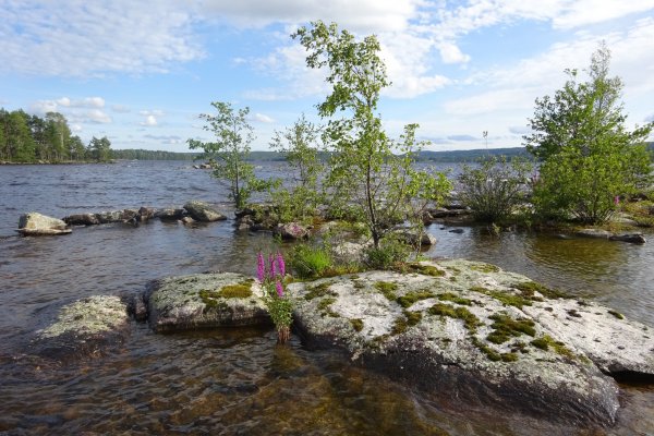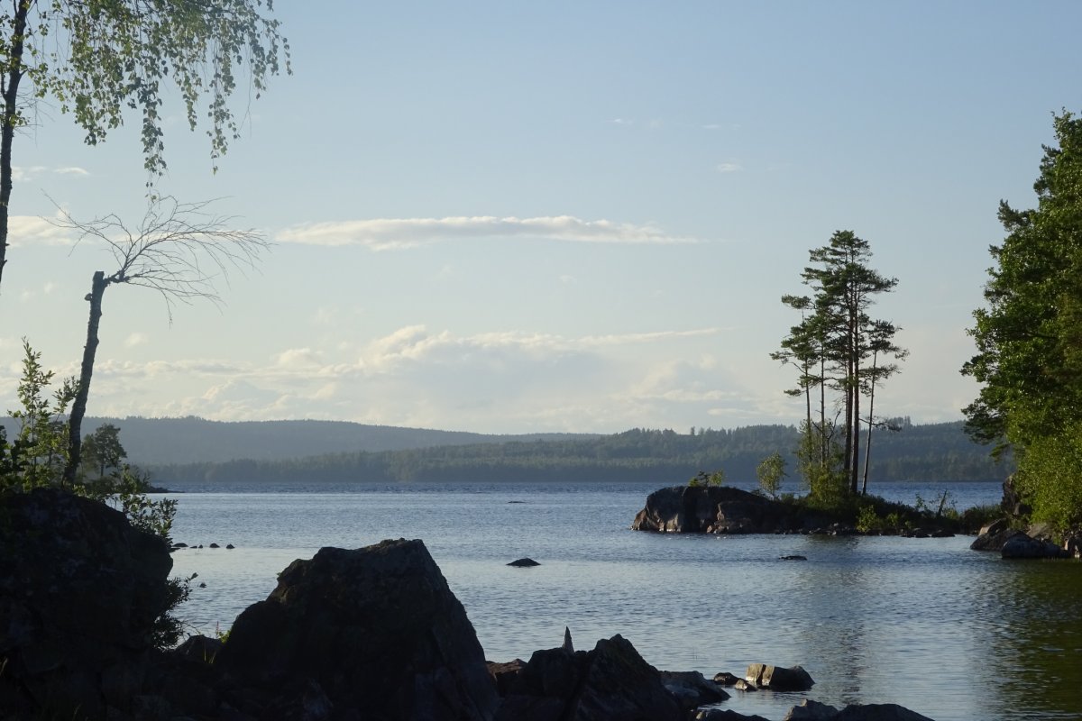 Der ehrgeizige Plan war, diesen See bereits am ersten Tag komplett zu durchqueren und möglichst die Umtrage in den Stora Gla zu schaffen. Kräftemäßig war das möglich, hatte ich doch in diesem Jahr nicht einen gageligen 11jährigen, sondern einen trainierten 13jährigen mit im Boot. Er selbst hatte das Kinderpaddel gegen einen Erwachsenenpaddel ausgetauscht.