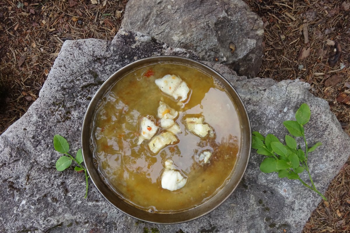 Nachdem der Sohn aufgewacht war, kochte ich das auf dieser Reise beste Essen, es war sicherlich fünf Sterne wert: „zarte Barschfilets im eigenen Fond mit Kartoffeln, Pilzen und Preiselbeeren.“