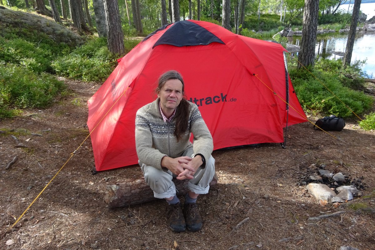 Beide Schutzhütten waren belegt, daher bauten wir den Veteranen von einem roten Scandtrack-Zelt hier das erste Mal auf. Der Sohn bereitete auf dem Spirituskocher den berühmten Jägerbraten mit Bohnen und Champignons. Dieser war, wie auch zwei Jahre zuvor, köstlich. Dann räumte ich mit letzter Kraft auf, während der Sohn angeln ging. Ein Schwächeanfall mit Kopfschmerzen ließ mich auf allen Vieren über den humosen Boden kriechen. Ich hörte einen freudvollen Ruf: „Ich habe einen!“ Kraftlos sah ich auf und nahm die sich bewegende Siluette des Jungen wahr. Er trug den Kescher, darin zappelte etwas. „Sehr schön!“ erwiderte ich, „Versuche es noch einmal.“ Kurze Zeit später tönte es: „Ich hab‘ noch einen!“ „Klasse!“ bemerkte ich dazu und versuchte, mir meinen desolaten Zustand nicht anmerken zu lassen. Irgendwie schaffte ich mich ins Zelt und in den Schlafsack, dann wurde es dunkel, ich tauchte ein in pechschwarze Finsternis.