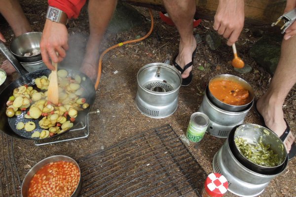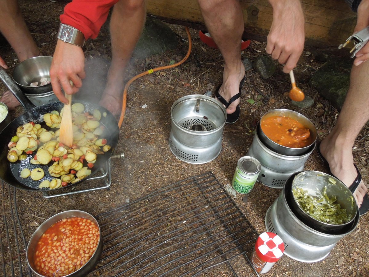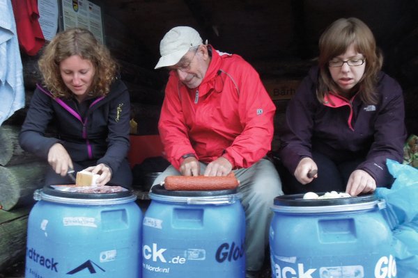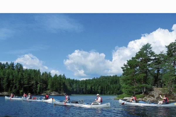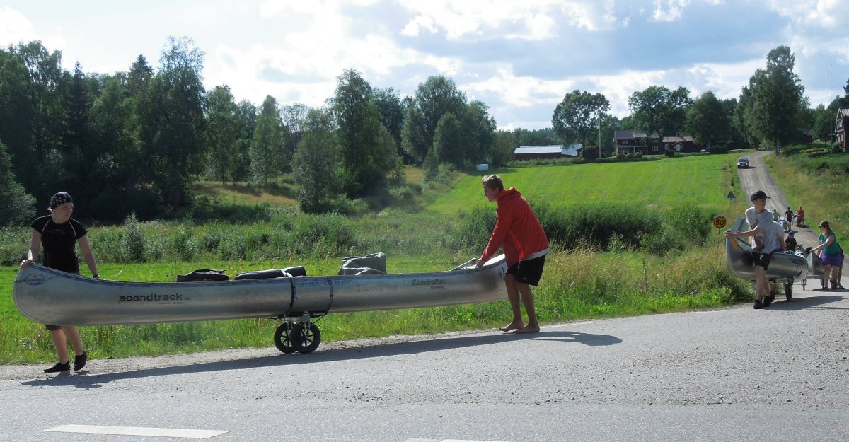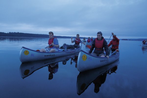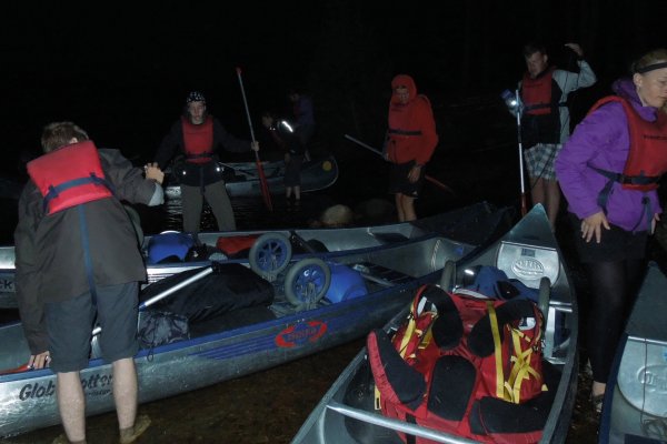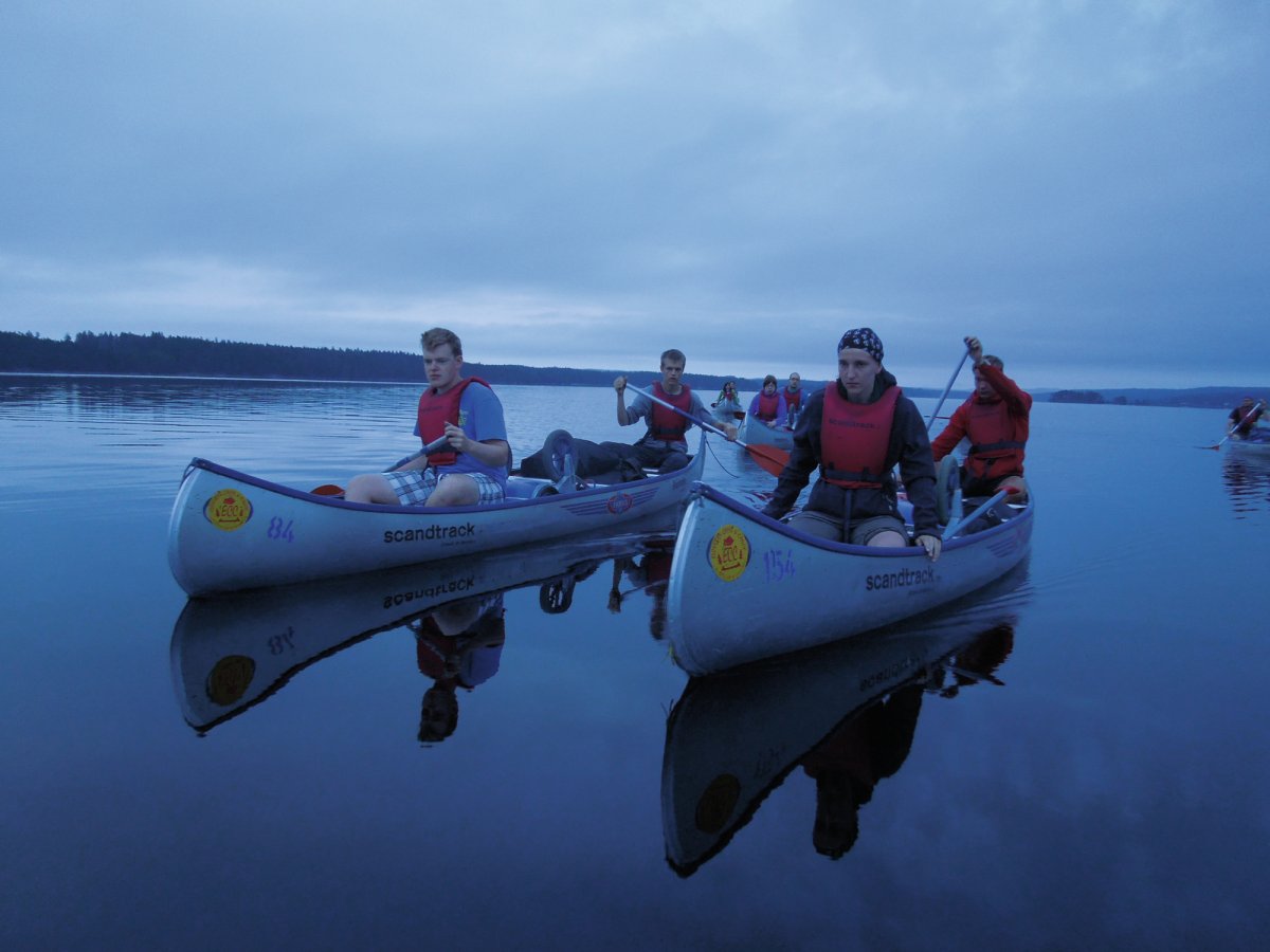 Nach 18 Stunden Fahrt erreicht der Bus das Scandtrack-Camp am Foxen-Ufer nördlich von Lennartsfors. Ich bin müde, hungrig und voller Erwartung. Es ist nach sieben Jahren Unterbrechung ein Wiedersehen. Mit Freunden war ich seit 1993 immer mal wieder hier, zuerst mit dem Motorkajütboot, später immer mit dem Kanu.- Wir empfangen eine umfangreiche Ausrüstung und Verpflegung, verstauen alles unter Anleitung von Guide Eric in den Booten, starten gegen 14:00 Uhr mit sieben Kanus. Starkregen, einige Blitze und Donner sind unsere Begleiter für die erste Stunde.- Die Strecke bis zur kleinen Insel Kollön ist kurz, dort ist das erste Lager schnell errichtet. Wir sortieren die Verpflegung neu, getrennt nach Früh- stück, Lunch und Dinner. Ich bin von der Menge und der Vielfalt überrascht. Vorbereitungen zum Abendessen: Tomaten, Gurken, Zwiebeln für einen Salat und Speck, Wurst und Zwiebeln als Anreicherung einer Dosen-Bohnensuppe müssen geschnitten werden. Alle packen an, Eric zaubert in der Großen Pfanne und dem Riesentopf ein leckeres Mahl. Leider auf dem Gaskocher, wegen Waldbrandgefahr ist absolutes Feuerverbot. Unter der Abendsonne stellen wir uns gegenseitig vor. Ich bin mit 72 Jahren mal wieder der Älteste, alle anderen könnten meine Enkel sein, kein Problem.