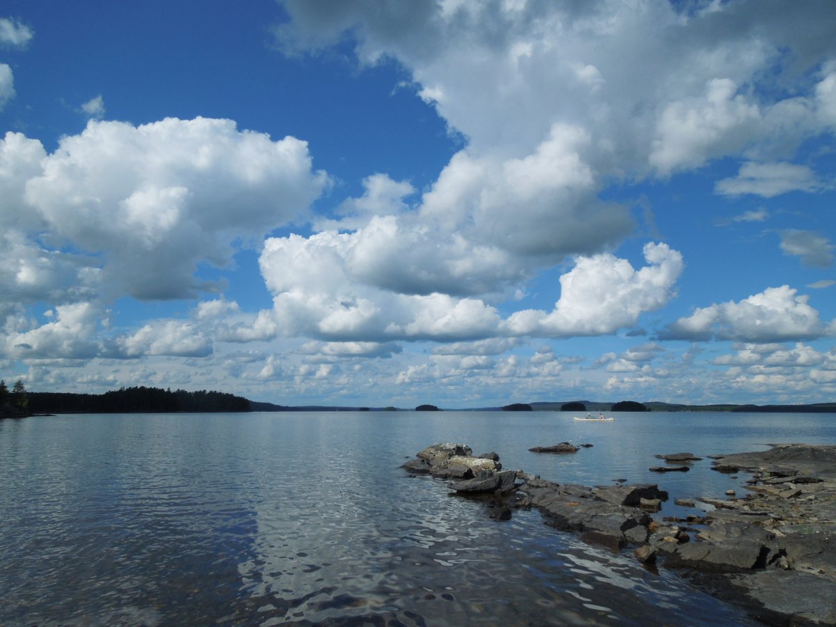 Der Dachs war da, Eric, der in seinem Schlafsack immer im Freien liegt, hat ihn vertrieben. Die Kanus sind wieder gegen 10:00 Uhr beladen, die Verpflegungstonnen inzwischen erheblich leichter geworden. Bei gutem Wetter geht es vorbei an der Kirche von Varvik und einer Fischfarm zur nächsten Umtrage. Danach queren wir den Lelang zum Lagerplatz 60. Ein langer Nachmittag bei Sonnenschein, Schwimmen im klaren See, Udo und Dennis angeln, wir bauen ein großes Waschbecken. Eric zeigt uns das Verhalten nach einer Kenterung, mit beladenem Boot und in voller Kleidung kann ich darauf verzichten. Nach dem Abendessen beladen wir soweit möglich die Boote und sind bald in den Zelten verschwunden, es wird eine kurze Nacht.